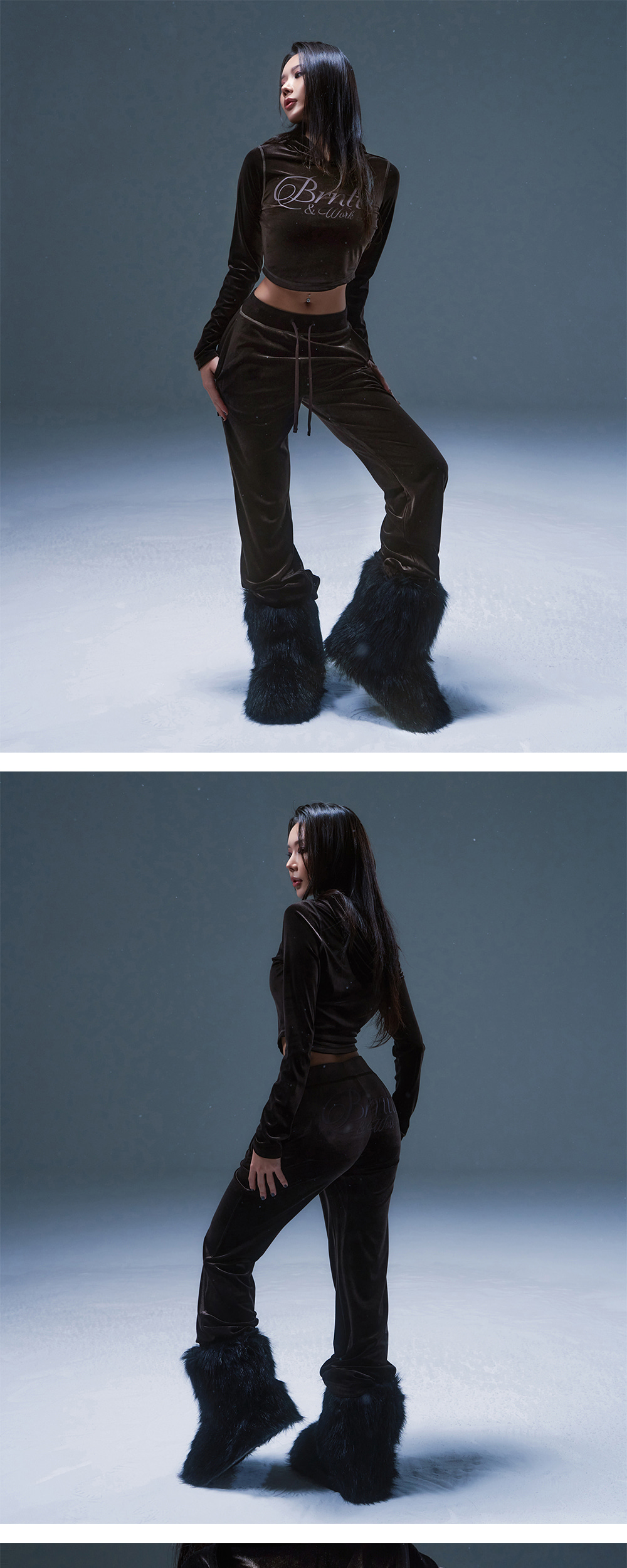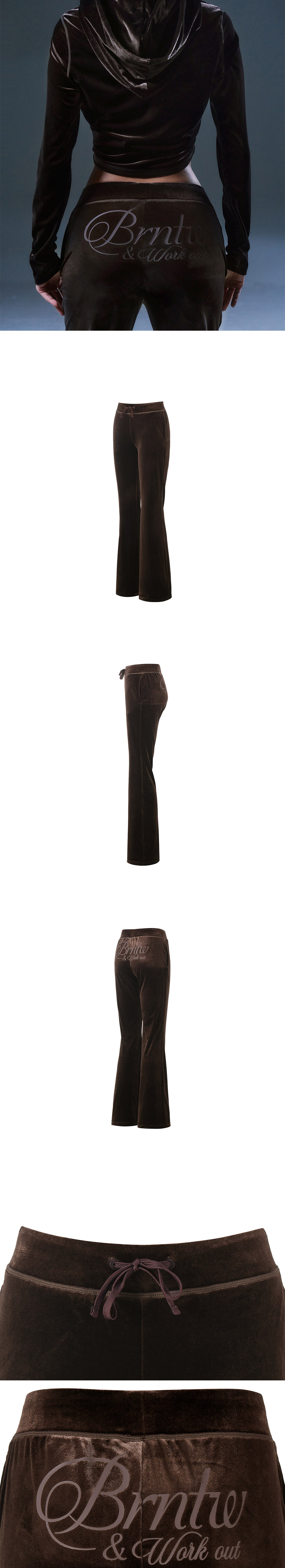 [DETAILS] * 벨루어 부츠컷 팬츠 - 소프트 벨벳 스판 원단 - Flocking 레터링 로고 - 배색 스티치 포인트 - 슬림핏 Material : POLYESTER 90%, POLYURETHANE 10% Fitting : NH 2 Size, 162cm, 46kg