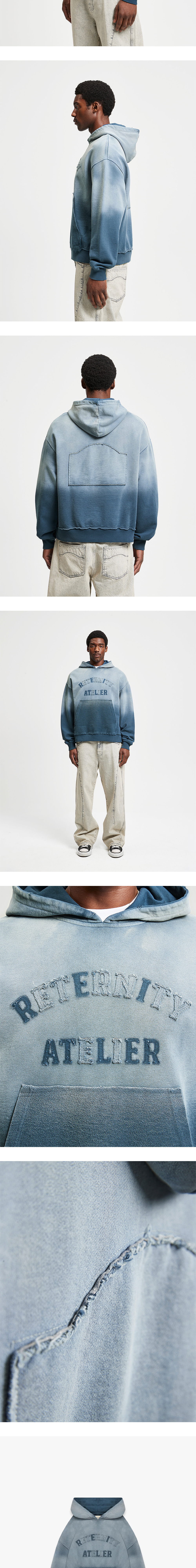 핸드메이드로 완성된 독특한 컬러와 디테일이 매력적인 리터니티의 에브니 후디입니다. - 박시한 실루엣 - 전면 로고 아플리케 및 자수 디테일 - 450gsm 코튼 100% - 수작업으로 진행된 컬러 페이딩 및 데미지 디테일 - 후면 시그니처 로고 패치 - 좌측 심라인 시그니처 탭 디테일 - Handmade in Europe * 모델: 186cm, L 사이즈 착용