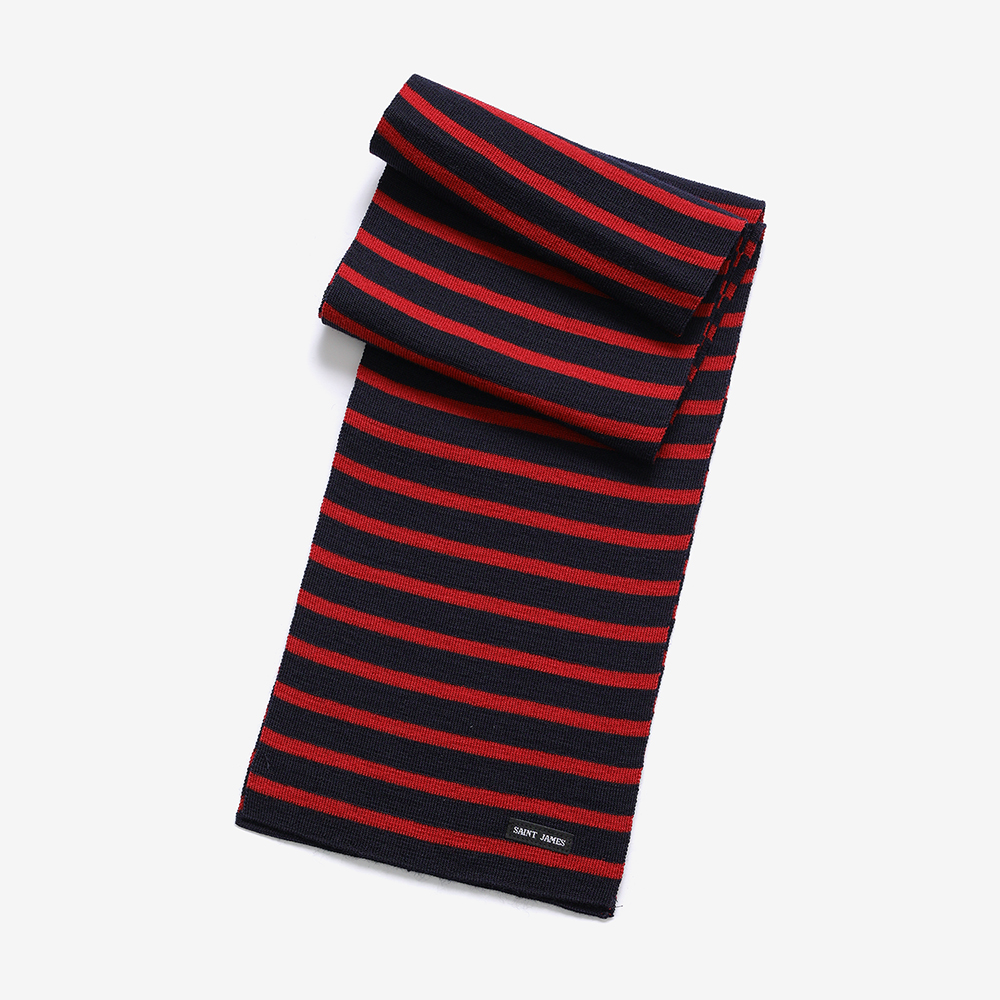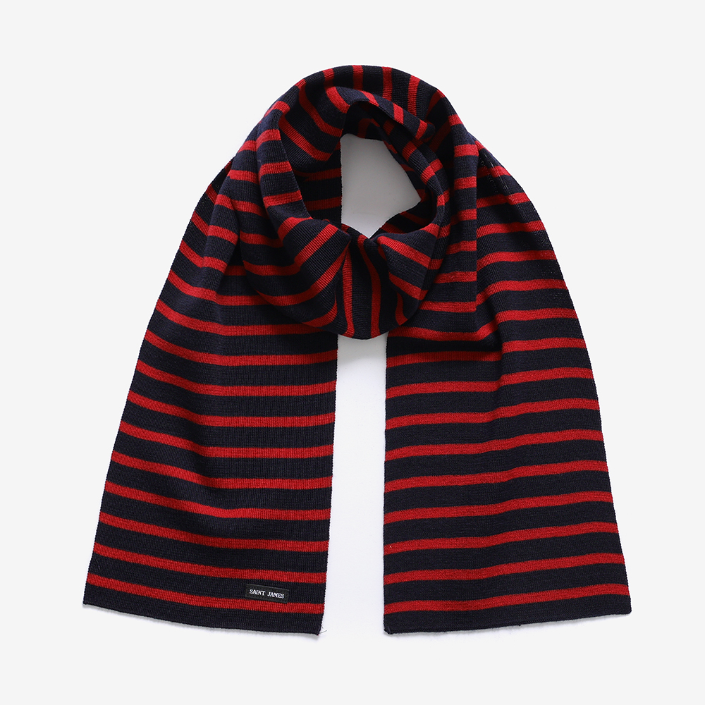 100% 울 소재의 스트라이프 머플러. 세인트 제임스 로고 패치가 붙어 있다."