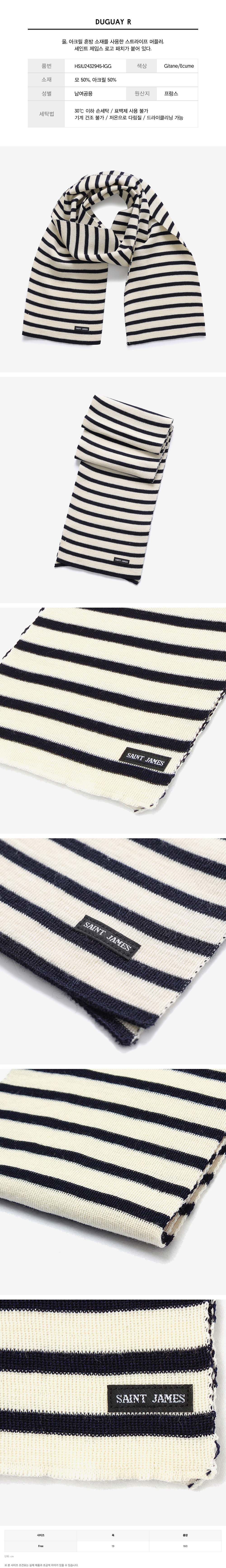 100% 울 소재의 스트라이프 머플러. 세인트 제임스 로고 패치가 붙어 있다.