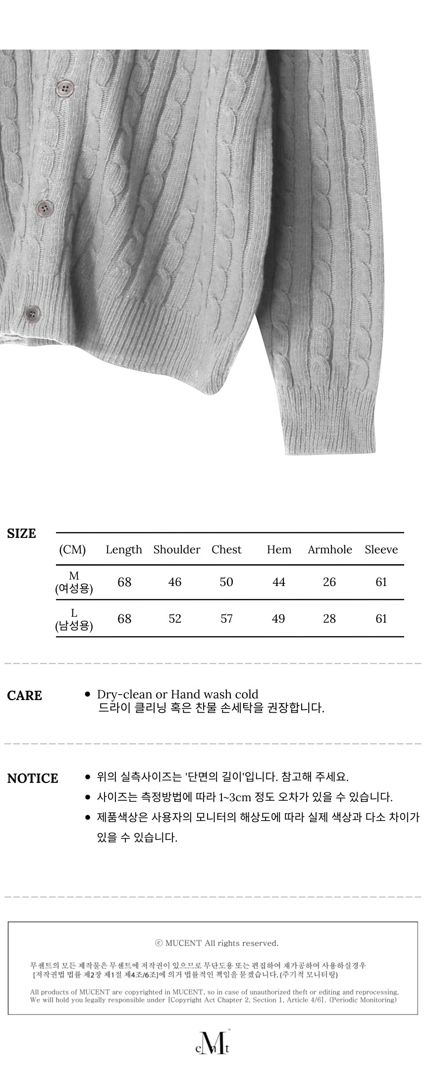 ┃Detail • 무센트 시그니처 로고 자수 포인트 • 쫀쫀한 텍스처감으로 편안한 착용감 • 베이직한 디자인으로 다양한 룩에 활용 • 간절기 이너 및 단품 착용에 적합한 두께감 • 클래식한 케이블 패턴으로 깔끔한 핏 연출 • 단추 여밈 방식 ┃Material : Polyester 100% ┃Care : Dry cleaning - 무센트는 말기의 행성인 이 지구에서 지속 가능한 옷들을 고민합니다. 우리는 신념을 소비하는 미닝아웃을 지지합니다.
