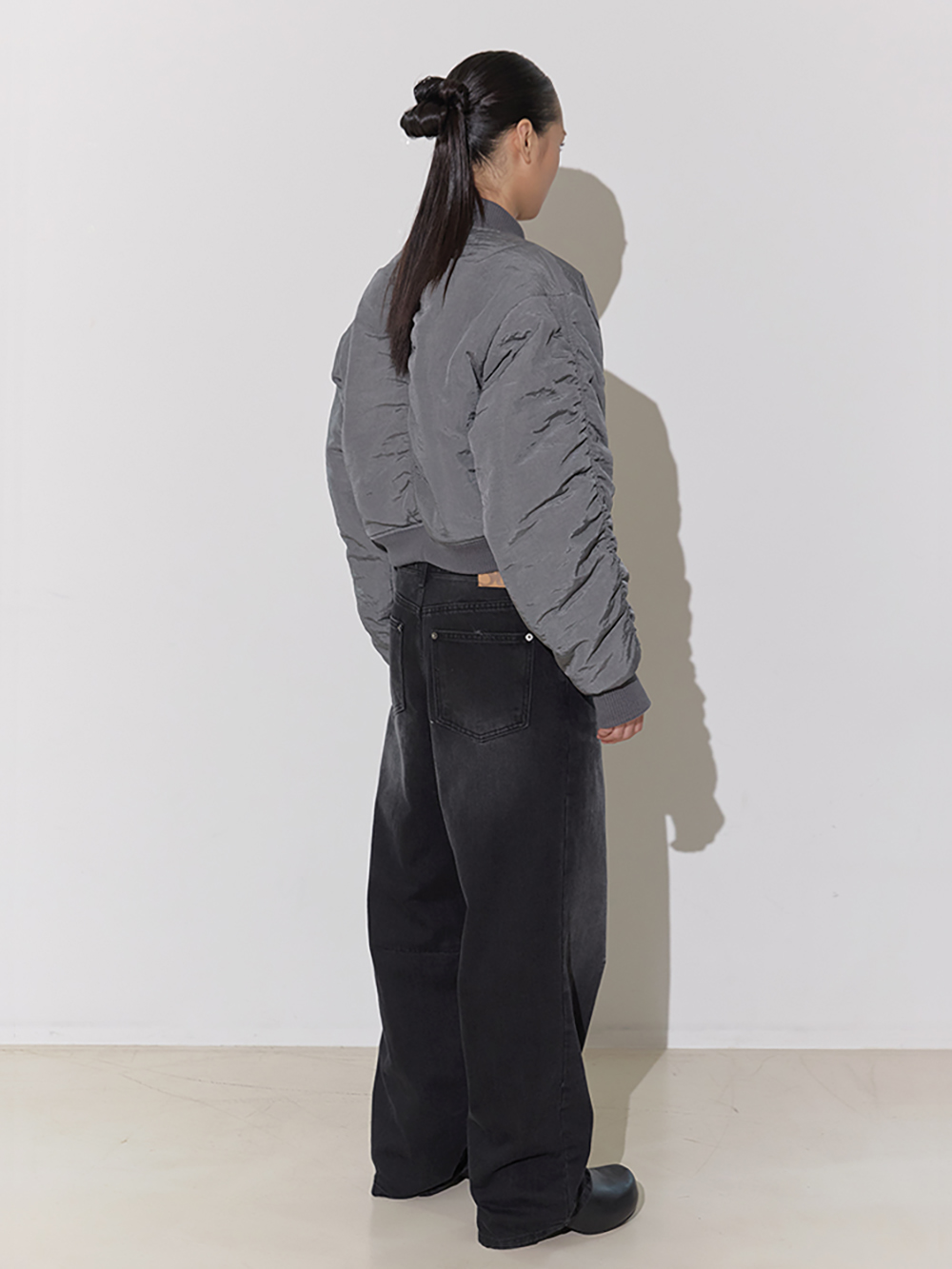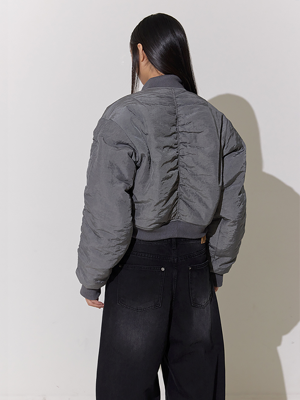 겉감 3온스, 안감 4온스 충전재 적당한 크롭 기장의 항공 점퍼 자켓 셔링 디테일 및 빈티지 무드의 소재 양면 착용 가능