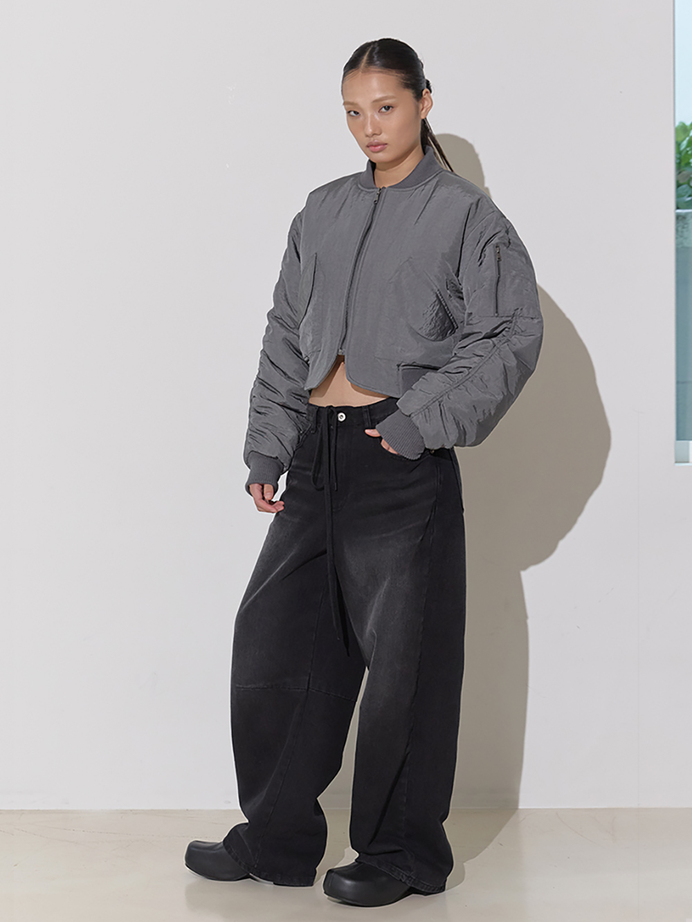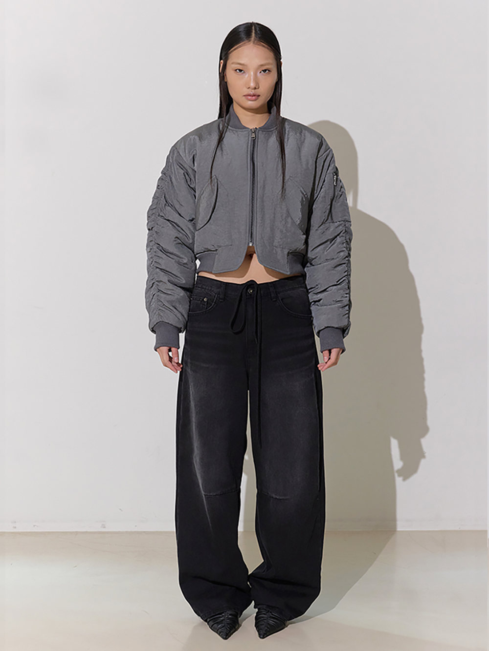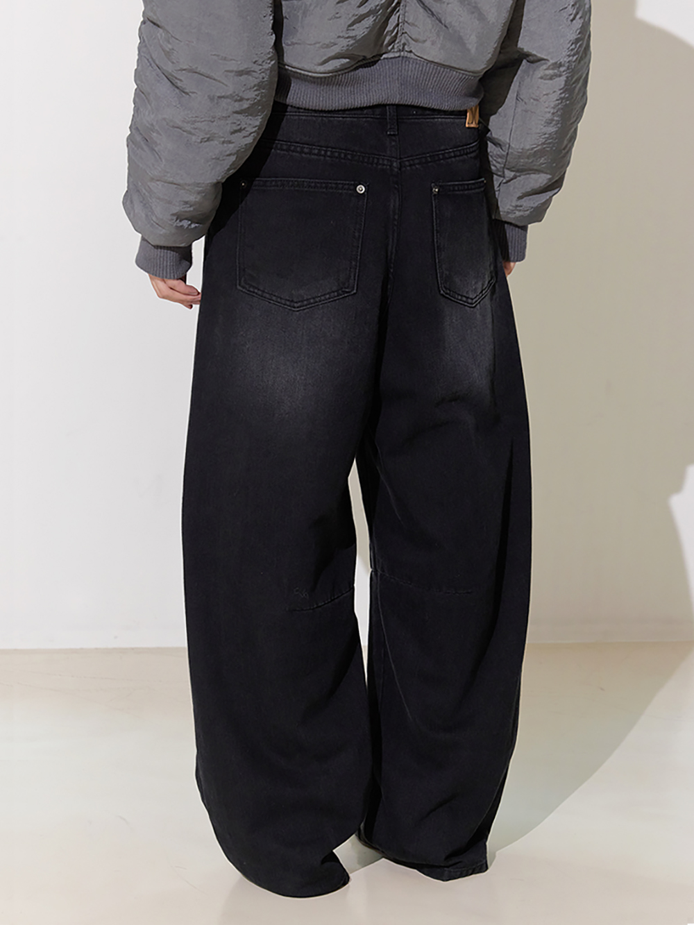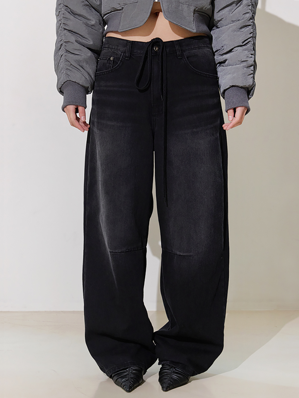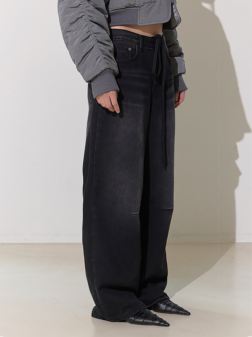 와이드 핏의 로우라이즈 디자인 브러쉬 디테일 포인트 및 스트링 허리조절 가능 데님 특성상 워싱 또는 브러쉬 작업이 일정하지 않을 수 있습니다.