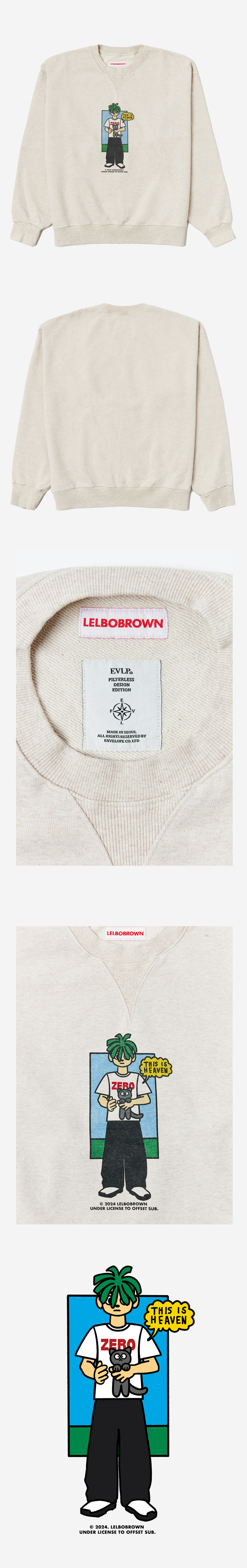 렐보브라운의 키치한 아트워크와 Envelope의 자연스러운 워싱과 실루엣으로, 90년대 밴드 스웨트셔츠 무드를 재현했습니다. - 빈티지 룩을 연출하기 위해 워싱 처리 와 자연스러운 프린팅 크랙 - 더블 스티치 - 네크, 숄더 라인 체인 스티치 - 리브 조직 V자 인셋 - 오버사이즈 - 에크루