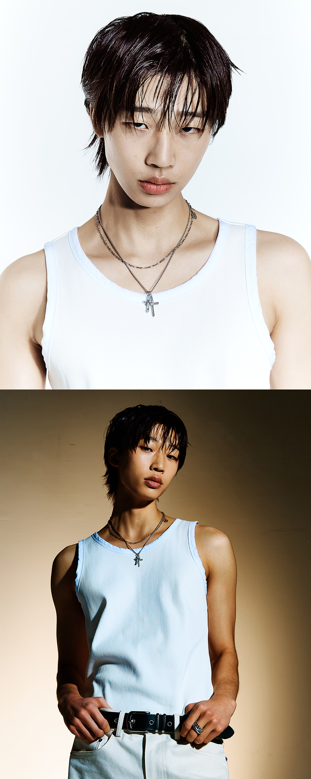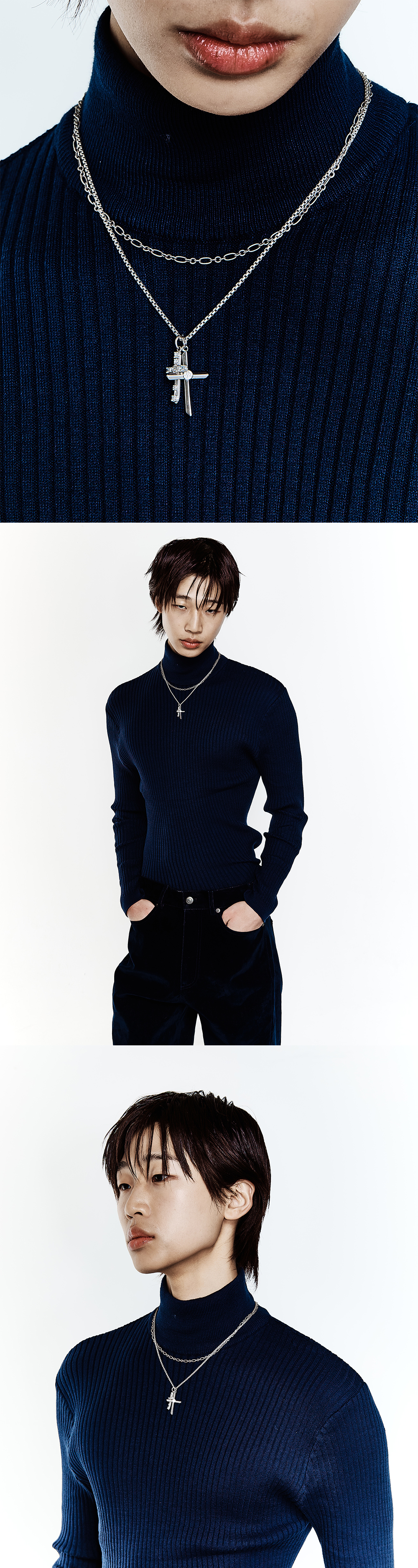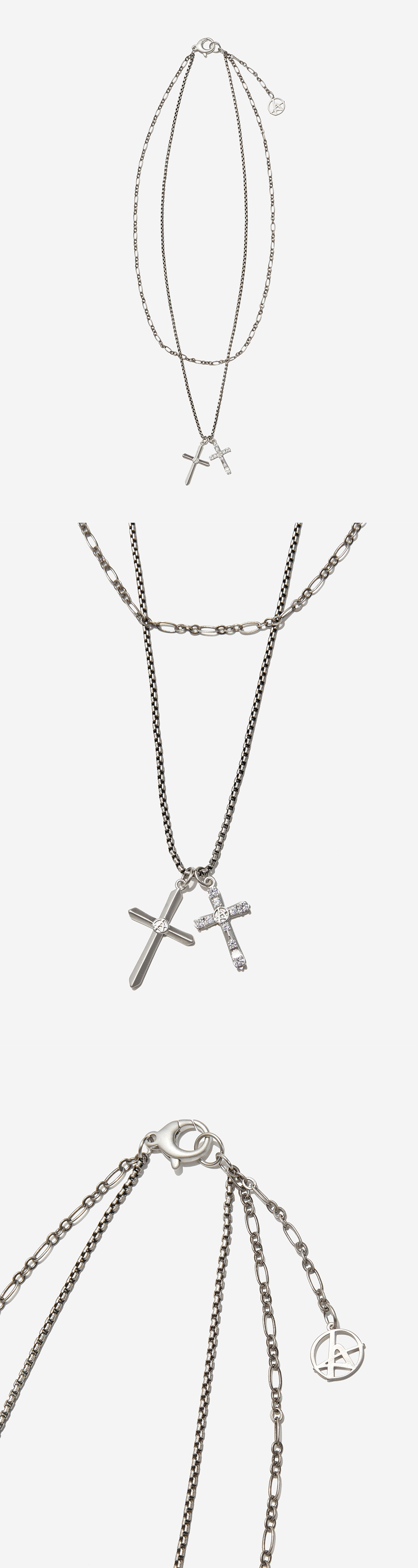 로고 심볼이 각인된 두개의 크로스 팬던트를 엮은 네크리스 입니다. 레이어드 형태의 체인으로 스타일리시하게 연출 하기 좋은 제품입니다. - DEATIL - 십자가 형태의 로고 팬던트 레어이드 체인