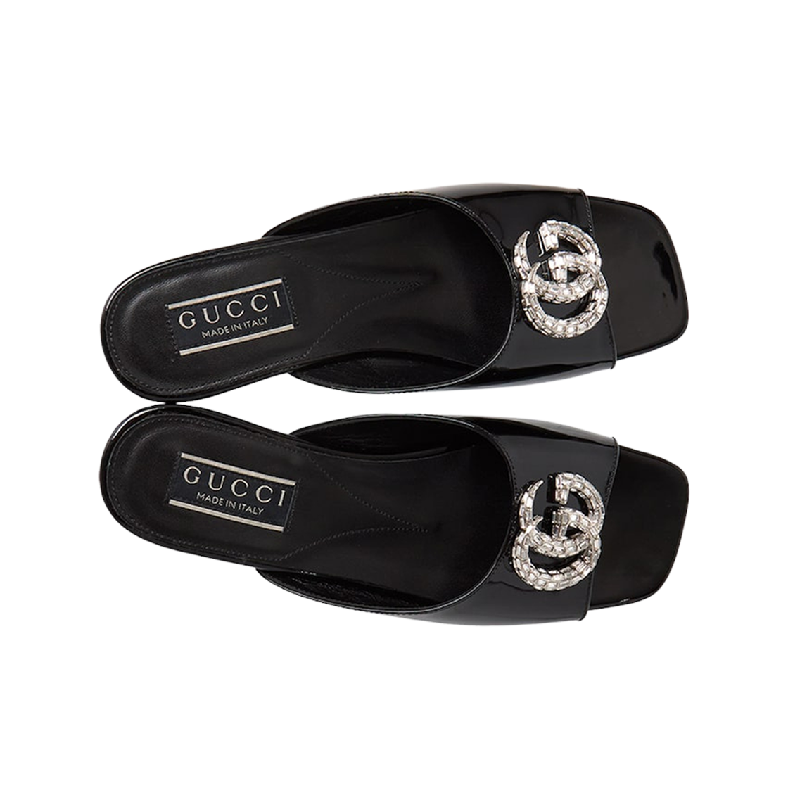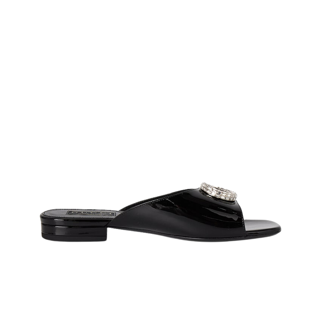 (W) Gucci Double G Slide Sandal Black Patent Leather