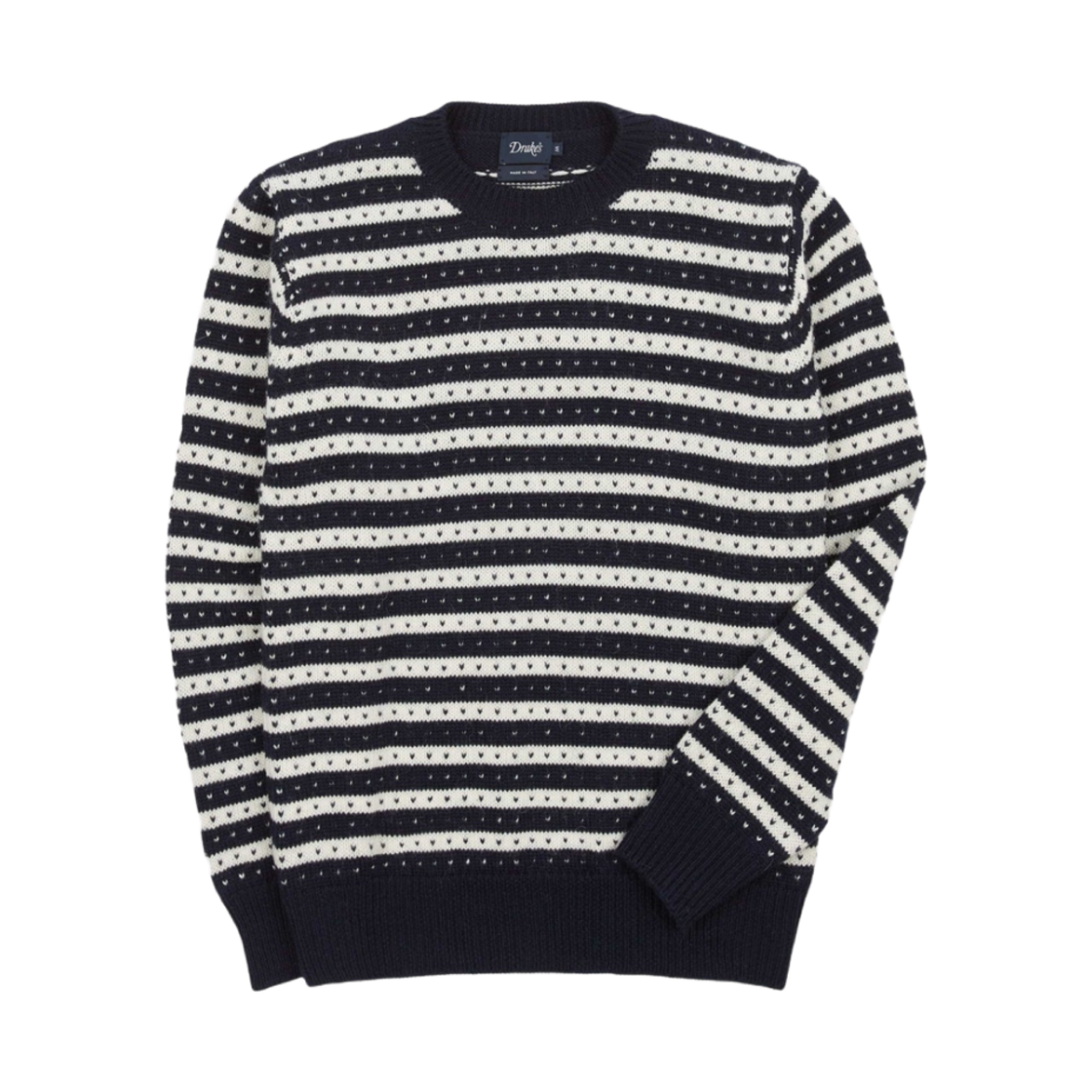 드레익스 노르웨지안 스트라이프 버드아이 울 알파카 크루넥 점퍼 화이트 네이비