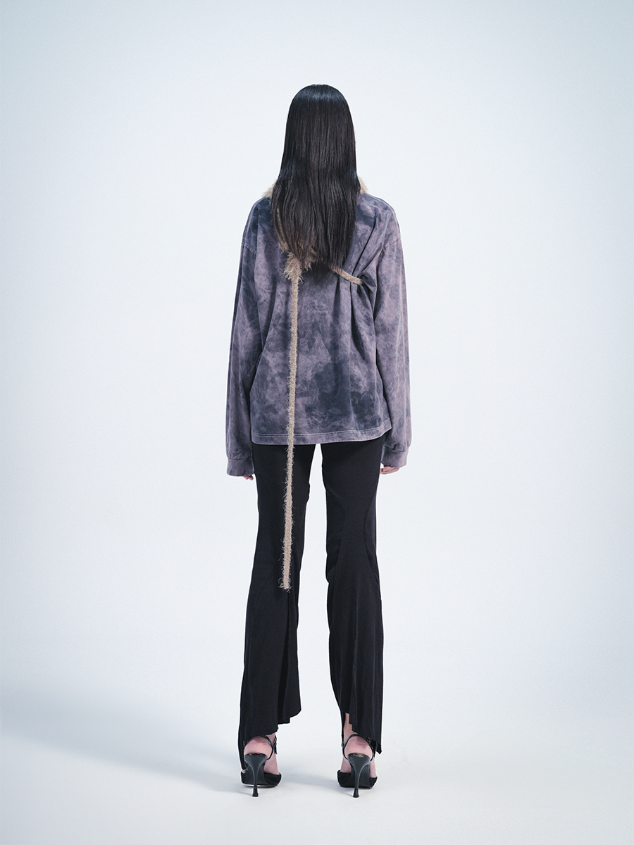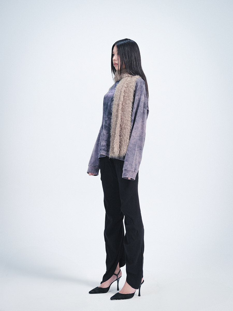 헤어리한 소재의 머플러 끈 디테일 다양한 스타일링 연출 가능 로고 각인 하드웨어 A hairy muffler String details Various styling is possible Logo-engraved hardware