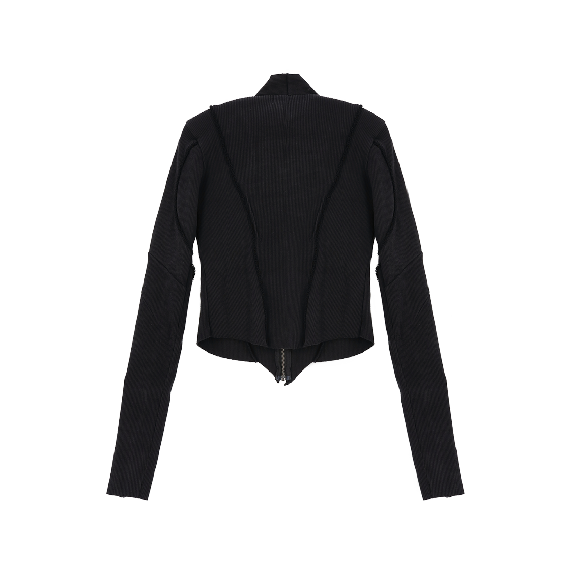 바이오 워싱 롱슬리브 자켓 타이트하고 크롭 기장 전면 그래픽 프린트 절개와 다트 디테일 로고 각인 하드웨어 Bio-washed long sleeve jacket tight and short length Front graphic print incision and dart detail Logo-engraved hardware