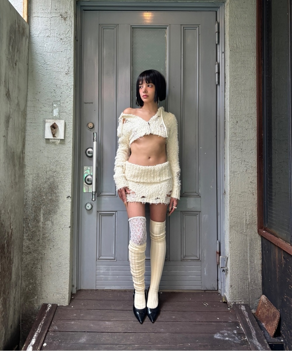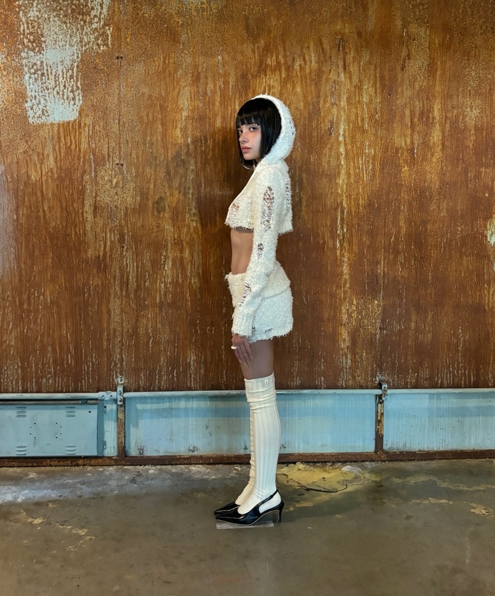 도톰한 부클 니트 소재로 텍스쳐와 데미지가 돋보이는 크롭 기장의 후드집업 입니다. 언더붑한 크롭 기장이 강조되는 라인 입니다. 허리 로고 라벨 디테일이 있습니다.