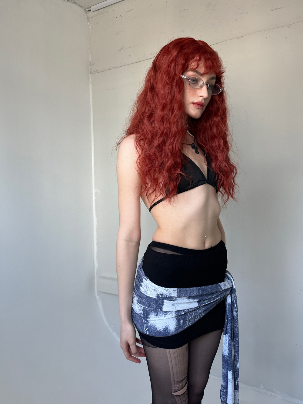 매듭을 묶어 연출하는 레이어드 형식의 데님 프린팅 미니 스커트 입니다. 매듭이 발 밑까지 내려오는 디테일을 강조 했습니다. 슬림한 핏이 강조되는 라인 입니다.