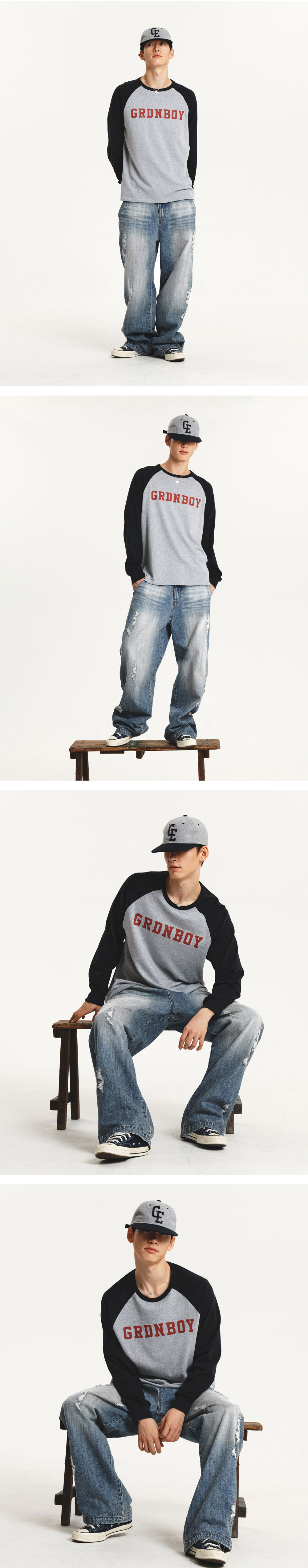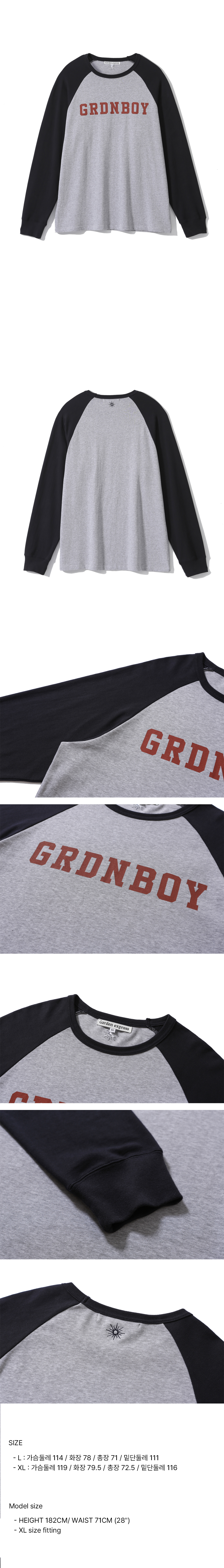 20수 2합의 바이오 워싱 처리를 더한 탄탄한 코튼 소재에 GRDN BOY 문구가 선명하게 프린팅된 래글런 소매 티셔츠
