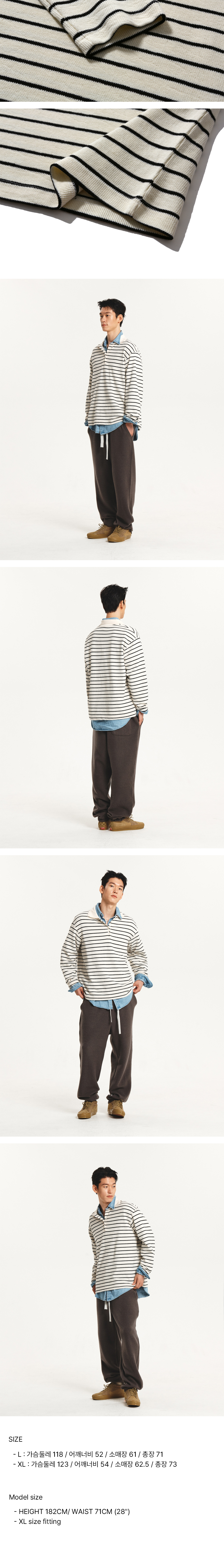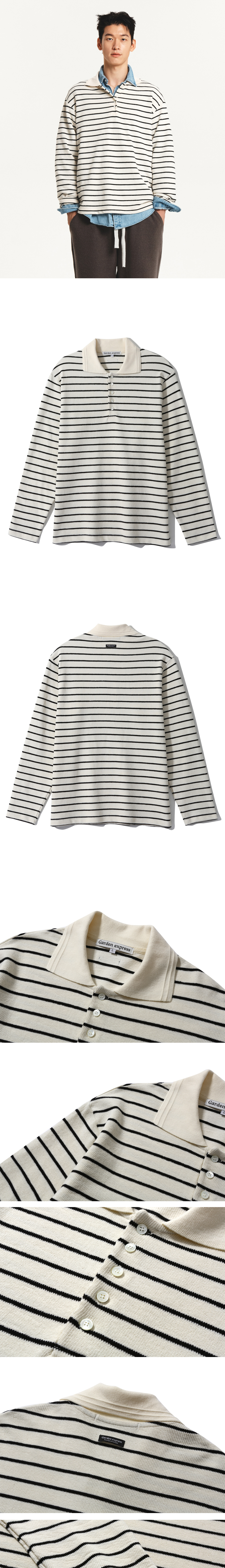 니트 칼라 디테일로 캐주얼하면서도 고급스러운 느낌을 주는 스트라이프 티셔츠