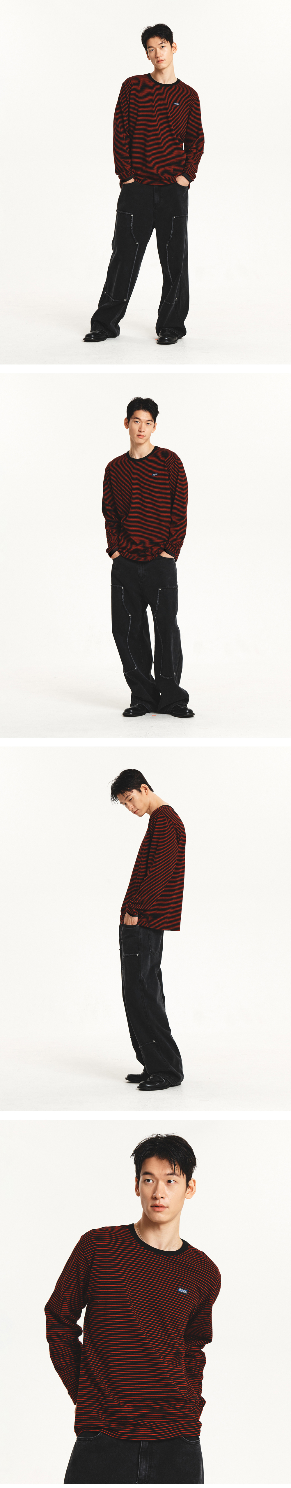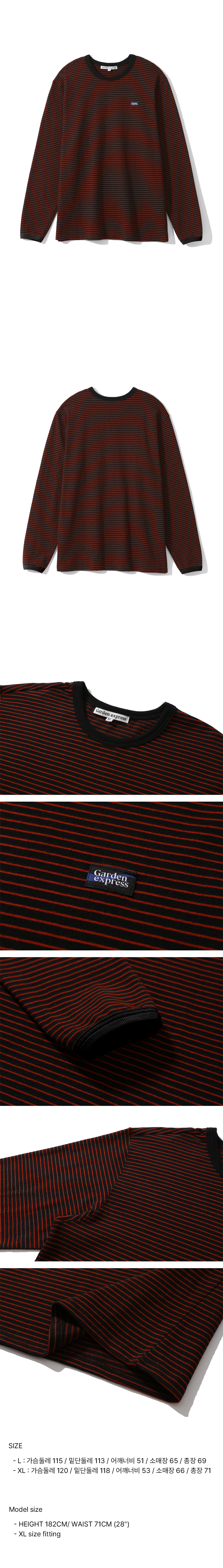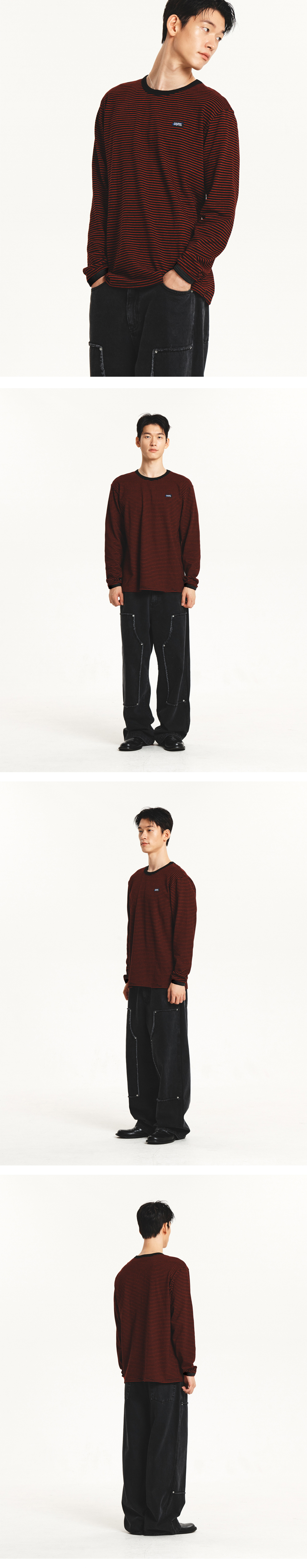 룩에 포인트를 줄 수있는 컬러를 은은한 잔스트라이프 패턴으로 풀어내 부담스럽지 않게 착용할 수 있는 티셔츠