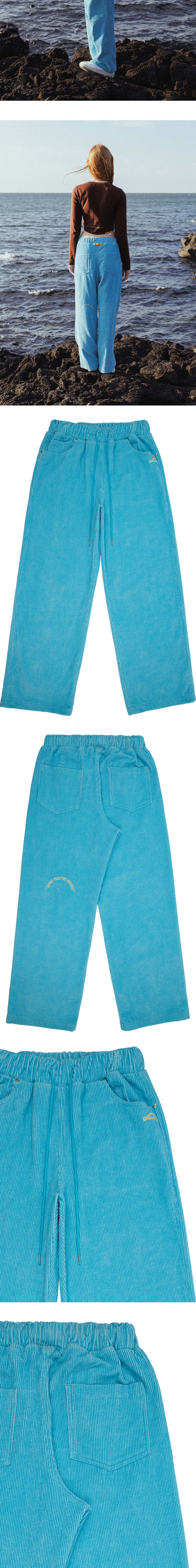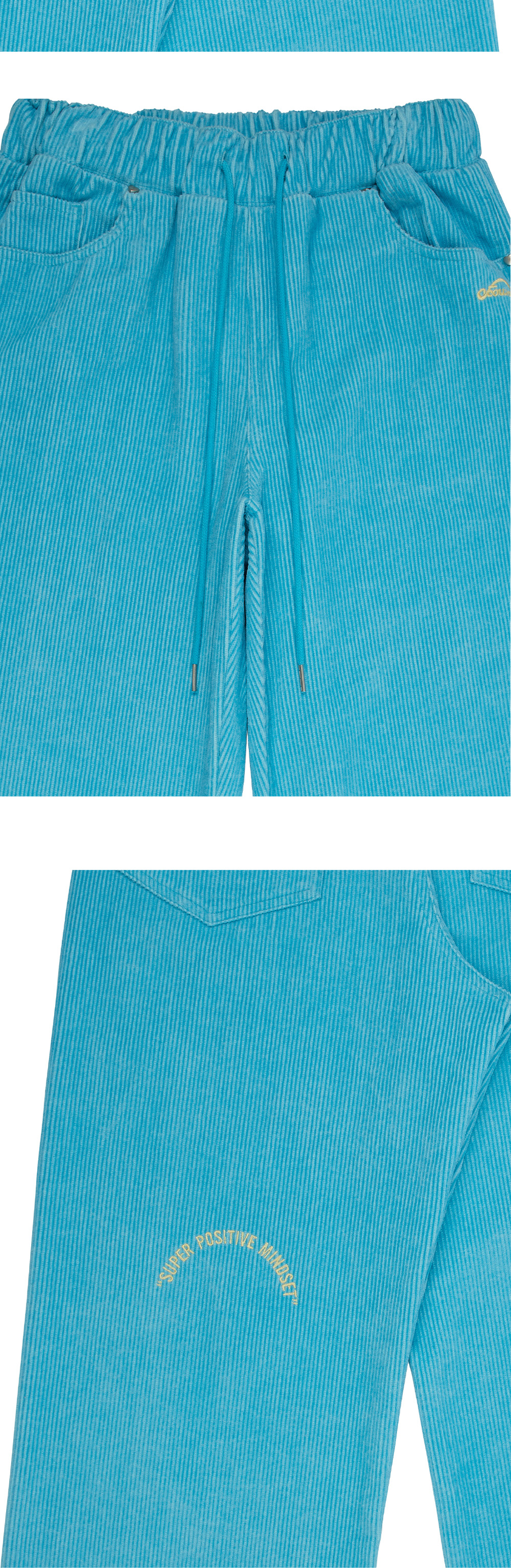 부드러운 터치감의 코튼100% 코듀로이 소재 피그먼트 바이오 가공으로 입체적인 컬러감 여유로운 느낌의 와이드핏 주머니의 귀여운 하트 리벳 허리 사이즈 조절 스트링,엘라스틱 밴딩 조거핏으로 연출 가능한 밑단 스트링 앞판 주머니 브랜드 로고 컬러포인트 자수 뒤판 브랜드 슬로건"SUPER POSITIVE MINDSET" 컬러포인트 자수