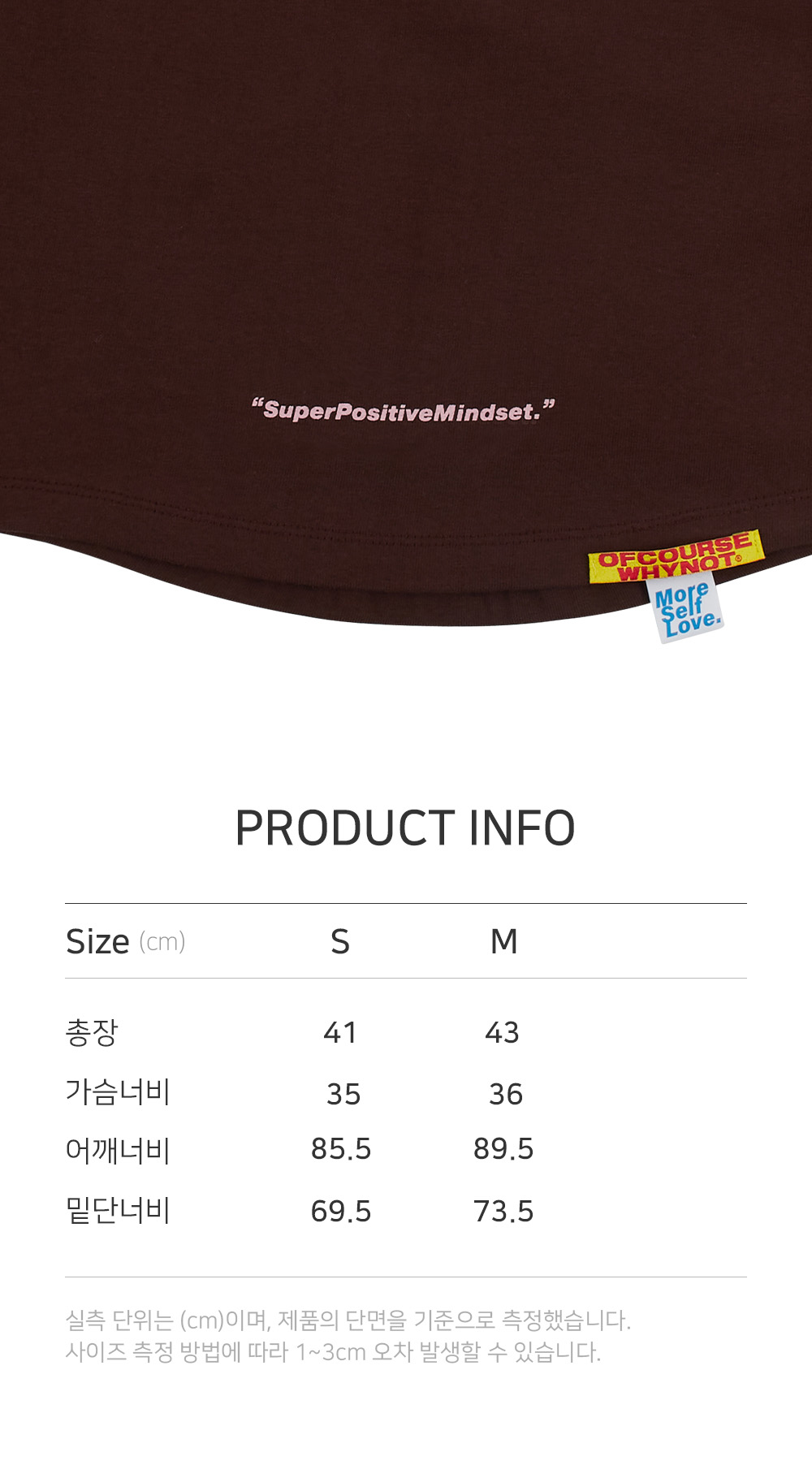 바이오 가공 된 부드러운 터치감의 코튼100% 소재 부담스럽지 않은 기장의 크롭 슬림핏 큐티한 밑단 굴림 앞판 브랜드 로고 메탈릭 펄 프린트 뒷판 브랜드 슬로건"SUPER POSITIVE MINDSET" 프린트 뒷판 브랜드 로고 포인트라벨 뒷판 브랜드 슬로건 "MORE SELF LOVE" 포인트 라벨