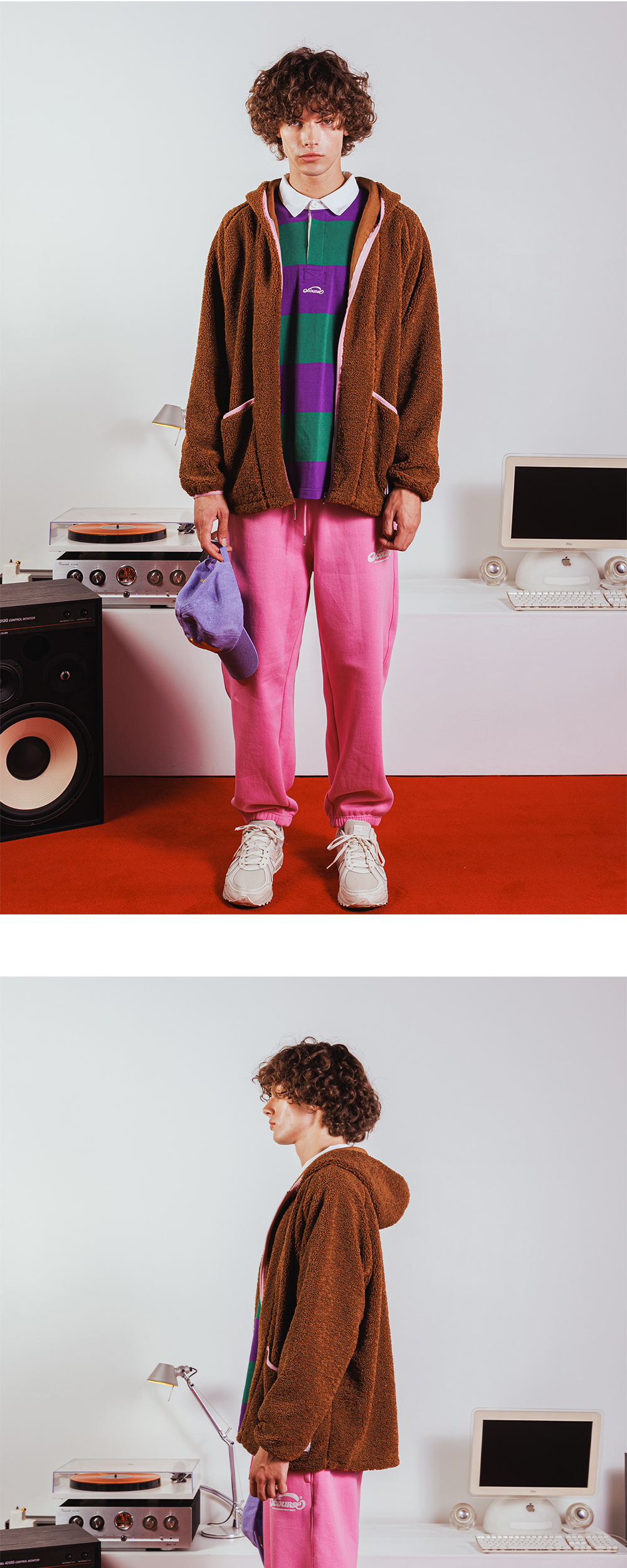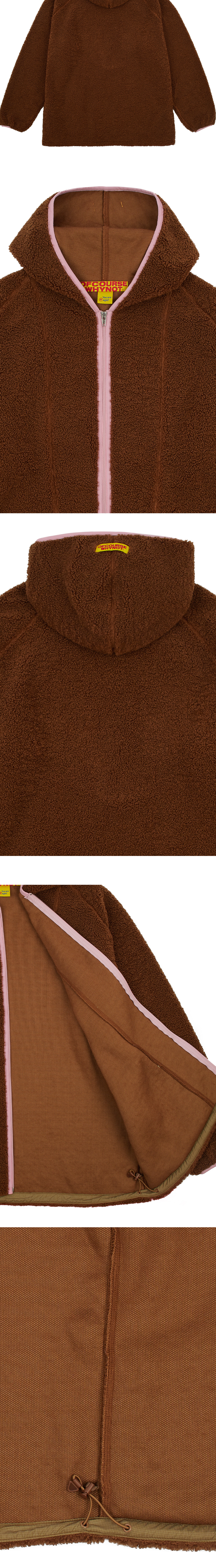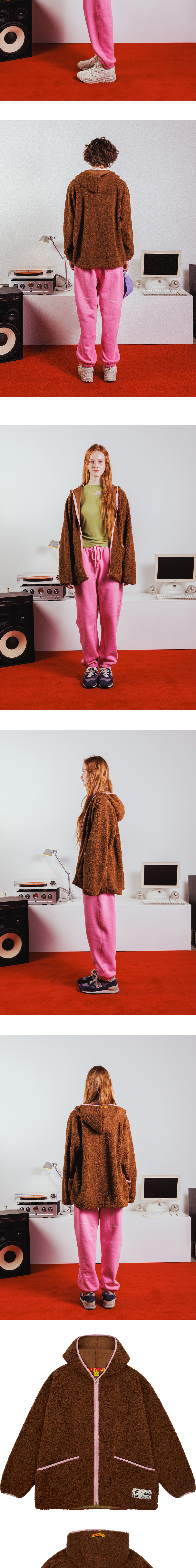 양털 모양의 부드러운 시어링 플리스 소재 안쪽 플리스 본딩 작업으로 높은 보온성 여유로운 유니섹스 오버사이즈 핏 활동성 높은 래글런 소매 배색 컬러 스판밴드 포인트 다양한 핏으로 연출 가능한 밑단 스트링 앞 주머니 브랜드 시즌 그래픽 포인트라벨 후드 중심 브랜드 로고 포인트라벨