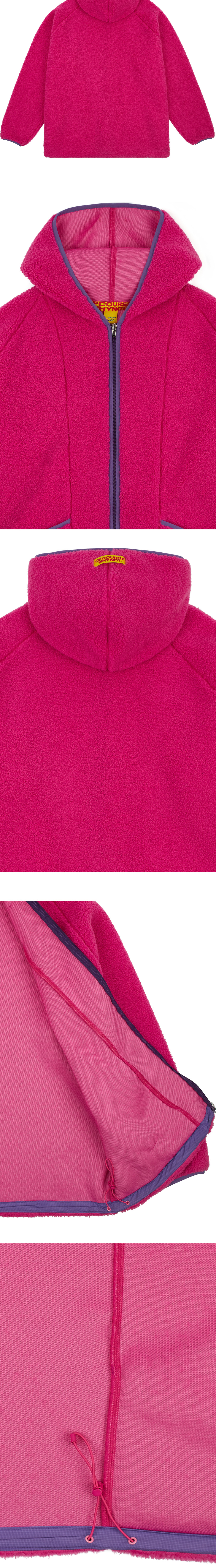 양털 모양의 부드러운 시어링 플리스 소재 안쪽 플리스 본딩 작업으로 높은 보온성 여유로운 유니섹스 오버사이즈 핏 활동성 높은 래글런 소매 배색 컬러 스판밴드 포인트 다양한 핏으로 연출 가능한 밑단 스트링 앞 주머니 브랜드 시즌 그래픽 포인트라벨 후드 중심 브랜드 로고 포인트라벨