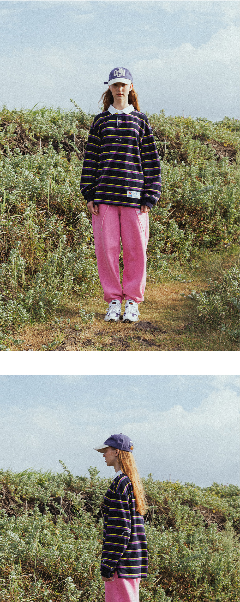 탄탄하고 부드러운 터치감의 면100% 소재 여유로운 느낌의 유니섹스 세미오버 핏 아이비 리그 무드의 멀티 스트라이프 패턴 화이트컬러 카라 배색 포인트 앞판,좌측 소매 브랜드 시즌 그래픽 컬러포인트 자수 앞판 브랜드 시즌 그래픽 포인트라벨 뒷판 브랜드 슬로건 "MORE SELF LOVE" 포인트 라벨