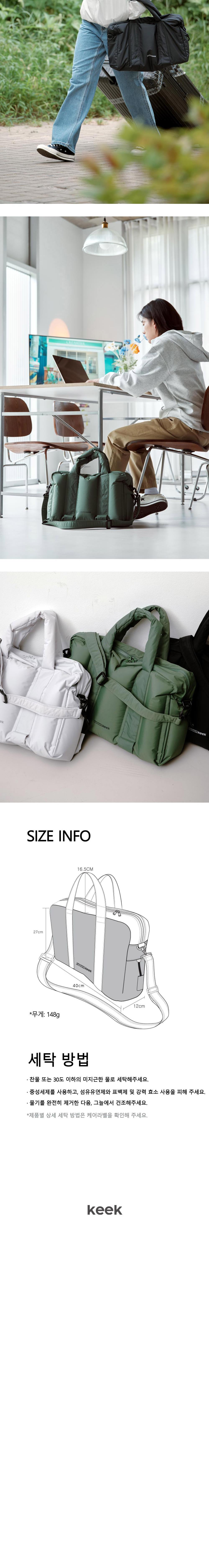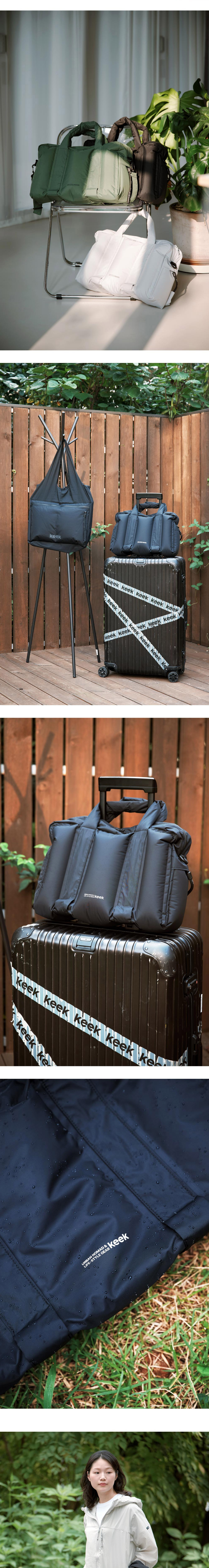 데일리, 비즈니스 출장, 단기 여행 등 다양한 용도에 어울리는 디자인으로 A3 사이즈 서류와 텀블러, 16인치 노트북을 넣을 수 있는 크기의 가방으로, 내부 수납공간이 풍부하며, 나일론 원단을 사용하여 가볍고 생활 방수 또한 가능합니다. 소지품을 넣은 후 AIR 주입 시 화장품이나 전자기기 등을 흔들리지 않게 고정시켜 보관할 수 있고, 내용물이 쉽게 손상되지 않습니다. 또한 등이나 몸에 밀착하여 쿠션 등의 목적으로 활용 가능합니다. 길이 조절 가능한 탈 부착식 숄더 스트랩이 있어 어깨에 걸칠 수 있고, 가방 손잡이는 캐리어에도 거치할 수 있도록 넉넉하게 제작되어 여행 길에서도 사용이 편리합니다. * 과도한 에어 주입 및 에어 주입 후 압력을 가할 시 Air 기능을 유실할 수 있으며 최대 80%의 에어 주입을 권장합니다.