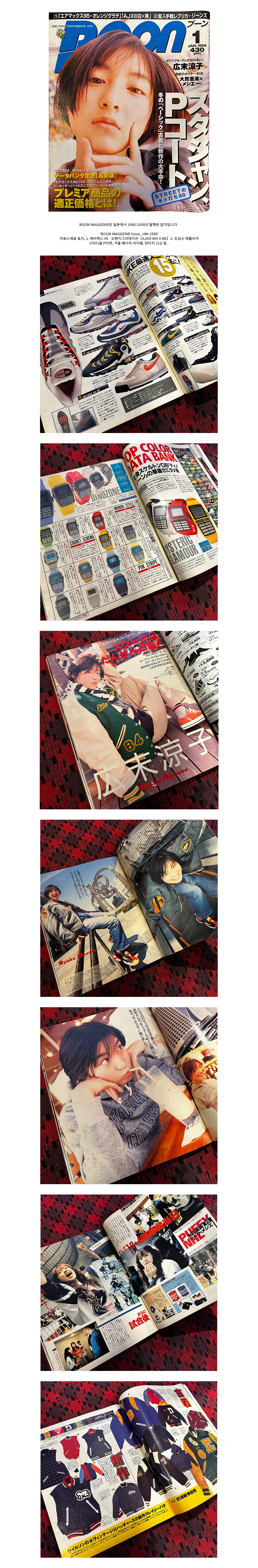 BOON MAGAZINE은 일본에서 1986-2008년 발행된 잡지입니다. ‘BOON MAGAZINE issue, JAN 1998’ 히로스에료 표지, 1. 에어맥스 95 ·오렌지그라데이션[AJXIII WH X BK]2. 초입수 레플리카 스타디움 P자켓, 겨울 베이직 아이템, 빈티지 신상 등..