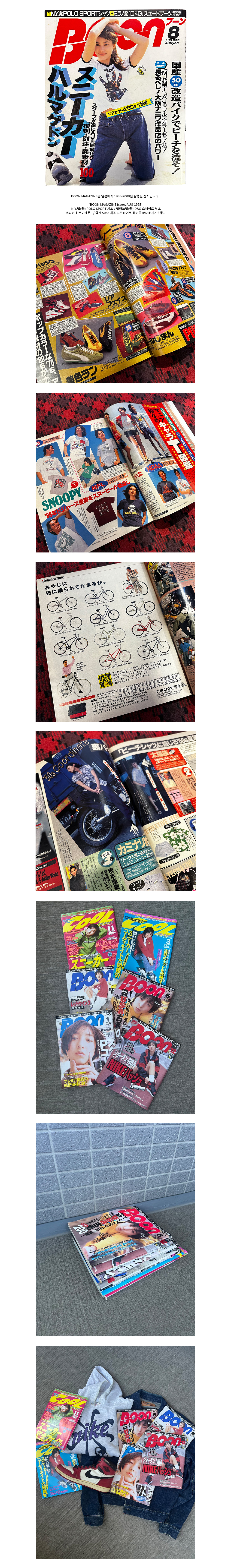 BOON MAGAZINE은 일본에서 1986-2008년 발행된 잡지입니다. ‘BOON MAGAZINE issue, AUG 1995’ N.Y.발(発) POLO SPORT 셔츠 / 밀라노발(発) D&G 스웨이드 부츠 스니커 하르마게돈 ! / 국산 50cc 개조 오토바이로 해변을 떠내려가자 ! 등..