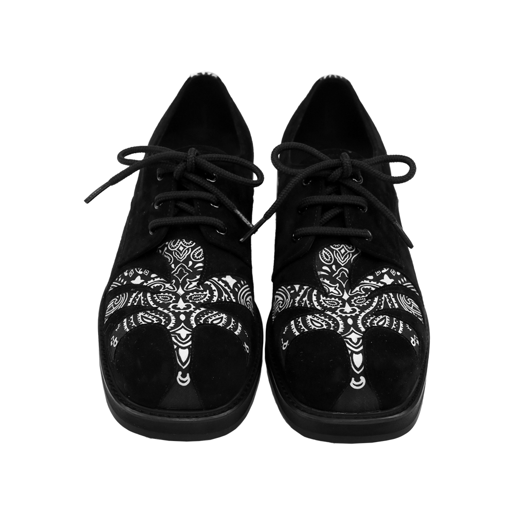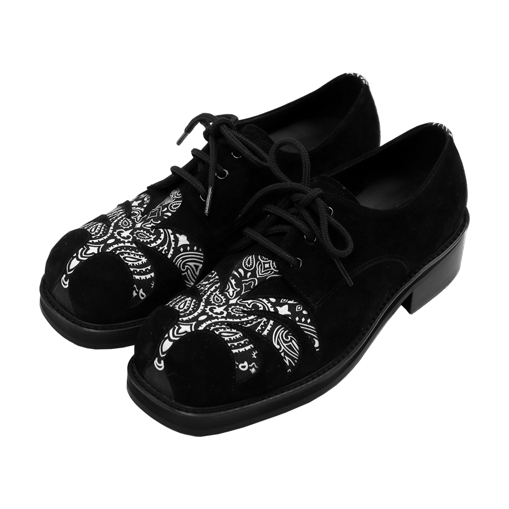 반다나 바이브 컬렉션 - 더비 슈즈 러프한 가죽 틈새 사이로 보이는 페이즐리 무드. 볼륨감 있는 앞코 위로 야자수 포인트. *소재 - Body : soft goat suede - Detail : paisley fabrics - Bottom : EVA *사이즈 - wide-01 fit - 발끝에서 떨어지는 각진 실루엣 + 토 부위 여유 공간 - 일반 정사이즈 (슬림한 신발 대비 반사이즈 다운 추천) (굽높이 3.5cm) *주문 제작 상품으로, 제작 기간은 결제 후 약 12일 소요됩니다.