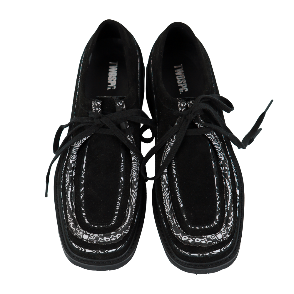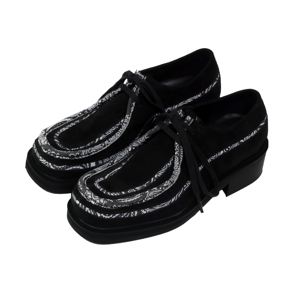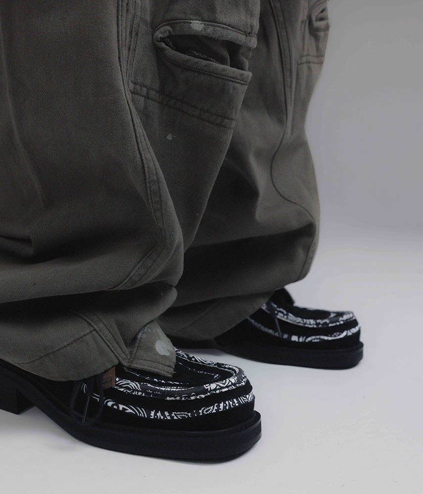 반다나 바이브 컬렉션. 왈라비 방식의 모카신을 재해석. 가죽의 위아래로 페이즐리 원단을 라이닝하여 볼륨감 강조. 발끝에 빈티지&스트릿 포인트. *소재 - Body : soft goat suede - Detail : paisley fabrics - Bottom : EVA *사이즈 - wide-01 fit - 발끝에서 떨어지는 각진 실루엣 + 토 부위 여유 공간 - 일반 정사이즈 (슬림한 신발 대비 반사이즈 다운 추천) (굽높이 3.5cm) *주문 제작 상품으로, 제작 기간은 결제 후 영업일 기준 약 12일 소요됩니다. *제품상자는 자사의 제품임으로 훼손시 환불이 불가합니다.