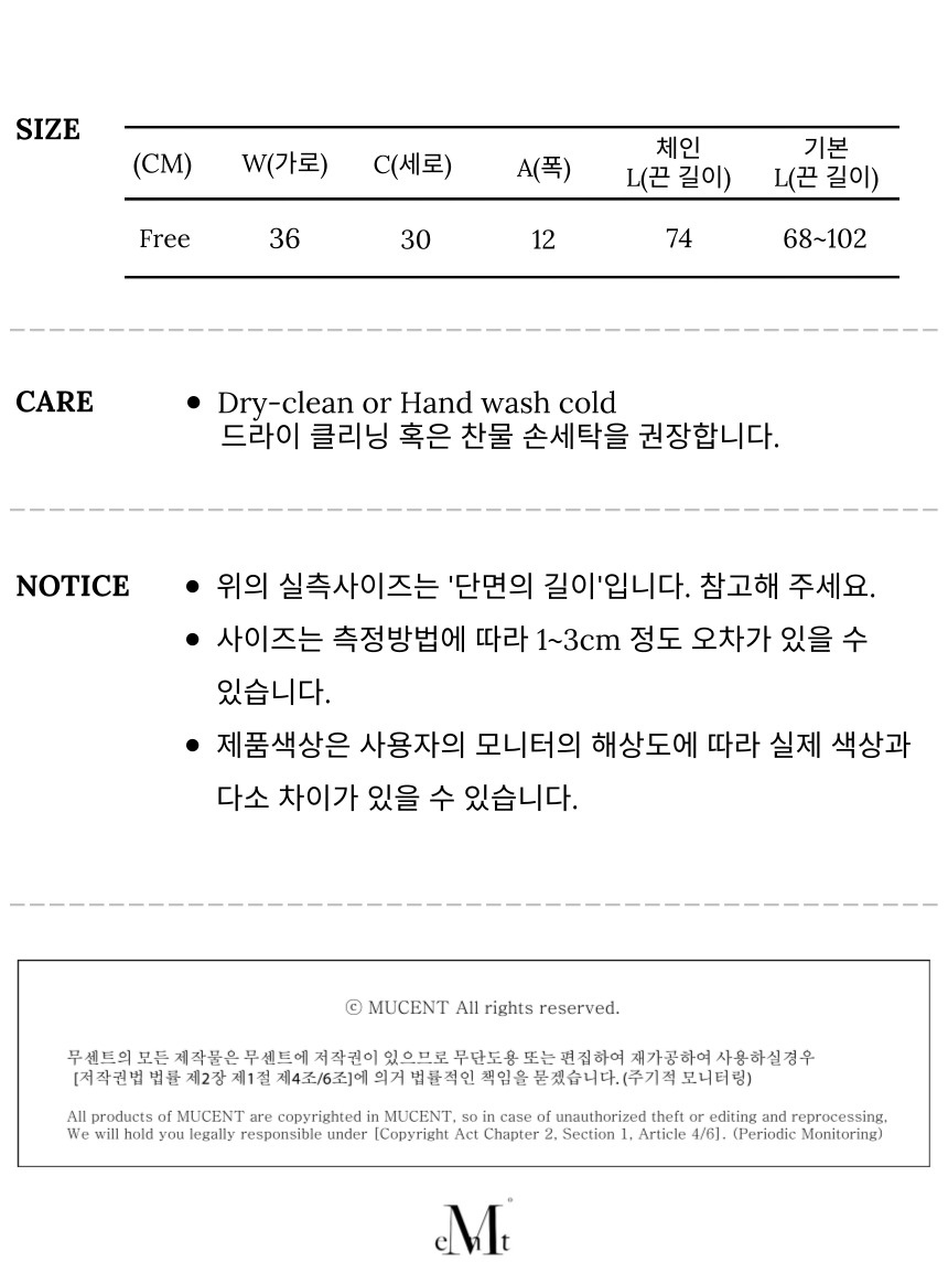 ┃Detail • 무센트 시그니처 자수 로고 • 스타일이 다른 스트랩 두개가 동봉되어 있어 교체하여 착용 가능 • 데일리하게 착용 가능한 아이템 • 3개의 수납부로 나뉘어진 내부 공간 • 얇고 흐물흐물한 가죽 원단 사용 • 지퍼 여밈 방식 ┃Material : Artificial leather 100% ┃Care : Dry cleaning - 무센트는 말기의 행성인 이 지구에서 지속 가능한 옷들을 고민합니다. 우리는 신념을 소비하는 미닝아웃을 지지합니다.