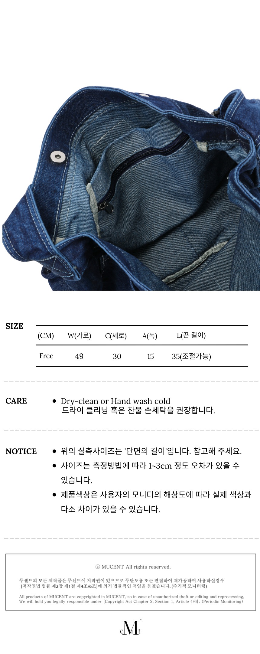 ┃Detail • 탄탄한 데님 원단 • 자석 여밈 방식 • 무센트 시그니처 로고 탭 포인트 • 넉넉한 수납 공간 • 내부 서브 포켓으로 높은 수납 활용도 • 사이드, 후면 서브 포켓으로 작은 소지품 보관 용이 • 유니크한 포인트로 착용 가능 숄더 백 ┃Material : Cotton 100% ┃Care : Dry cleaning - 무센트는 말기의 행성인 이 지구에서 지속 가능한 옷들을 고민합니다. 우리는 신념을 소비하는 미닝아웃을 지지합니다.