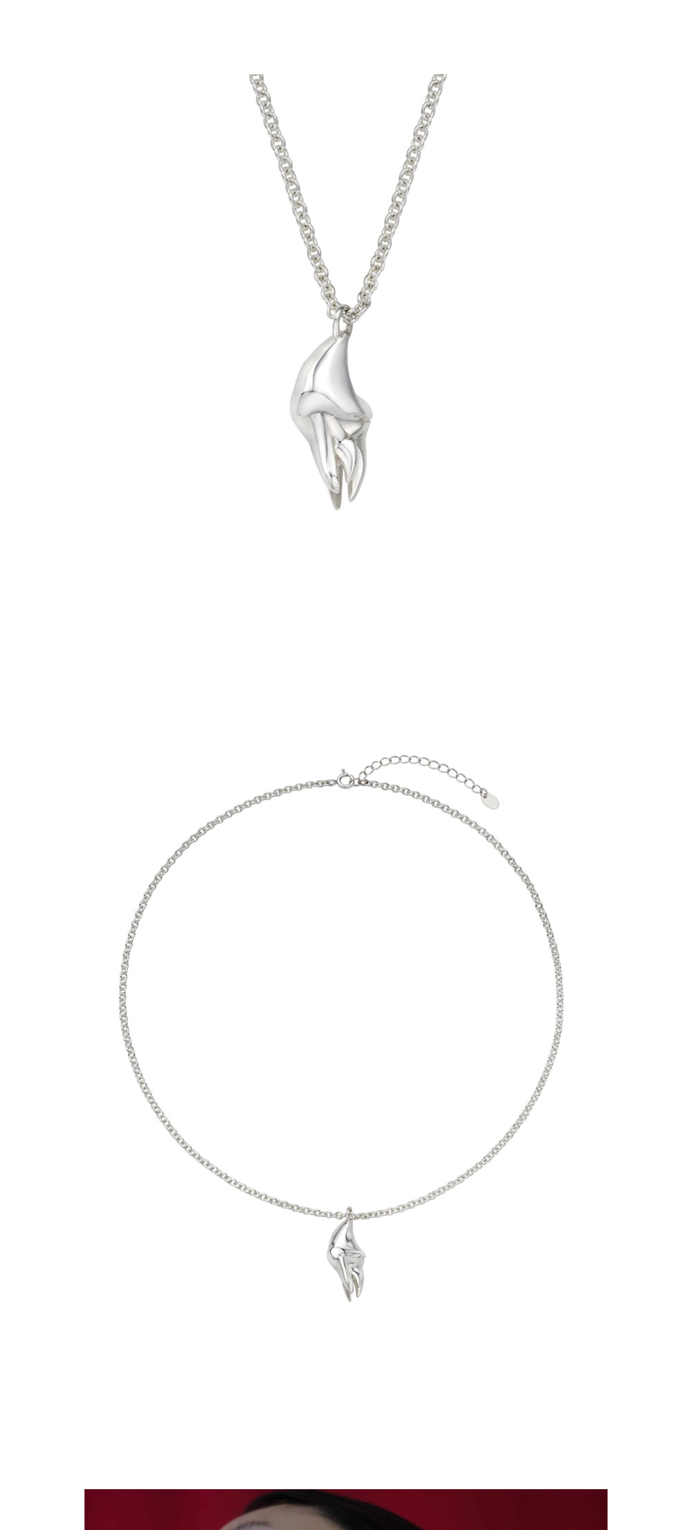 길게 변형한 송곳니 실루엣을 중심으로 한 네크리스입니다. 날카로운 끝선과 입체적인 조형이 특징이며, 회전하는 순간의 찰나를 연상케 합니다.