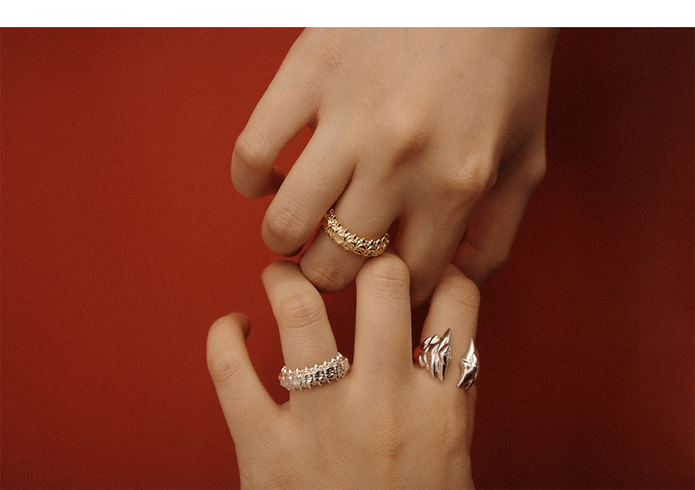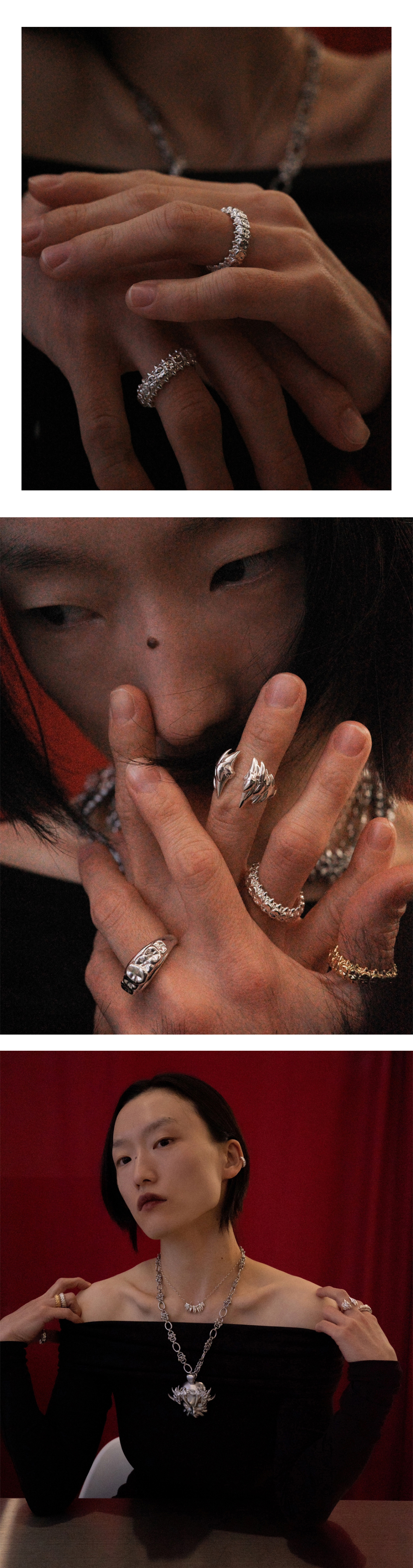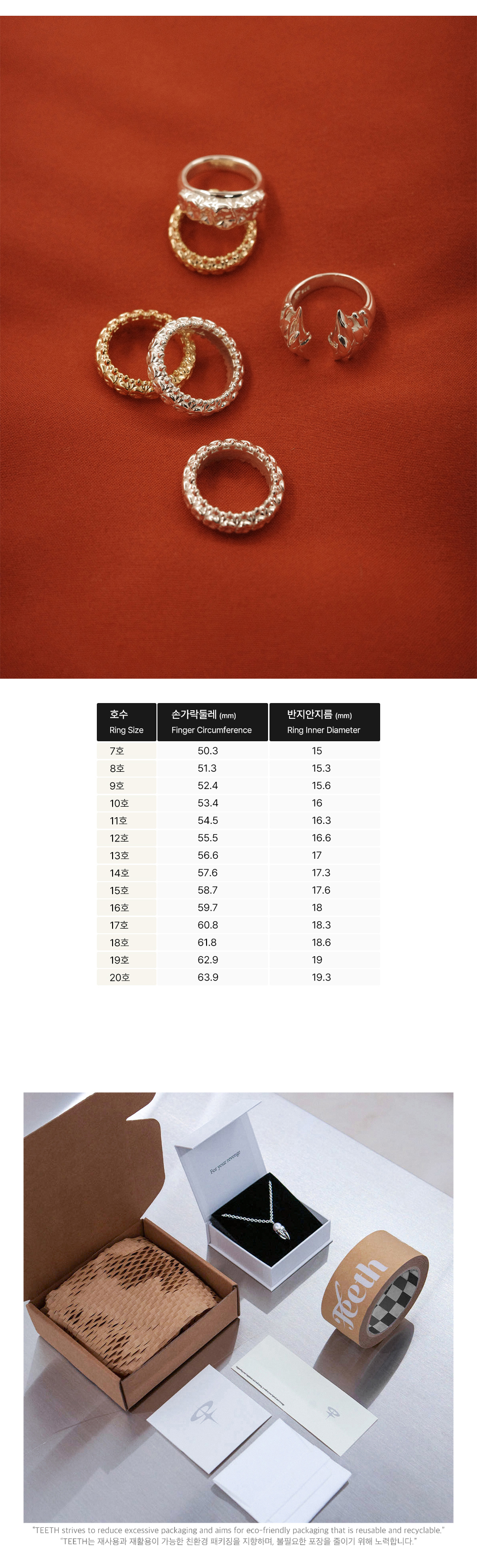 어금니를 바탕으로 한 형태에, 송곳니처럼 솟은 돌기가 반복된 링입니다. 둥근 베이스 위에 뾰족한 요소가 이어지며, 덩굴에 엮인 듯한 이미지를 연상시킵니다.