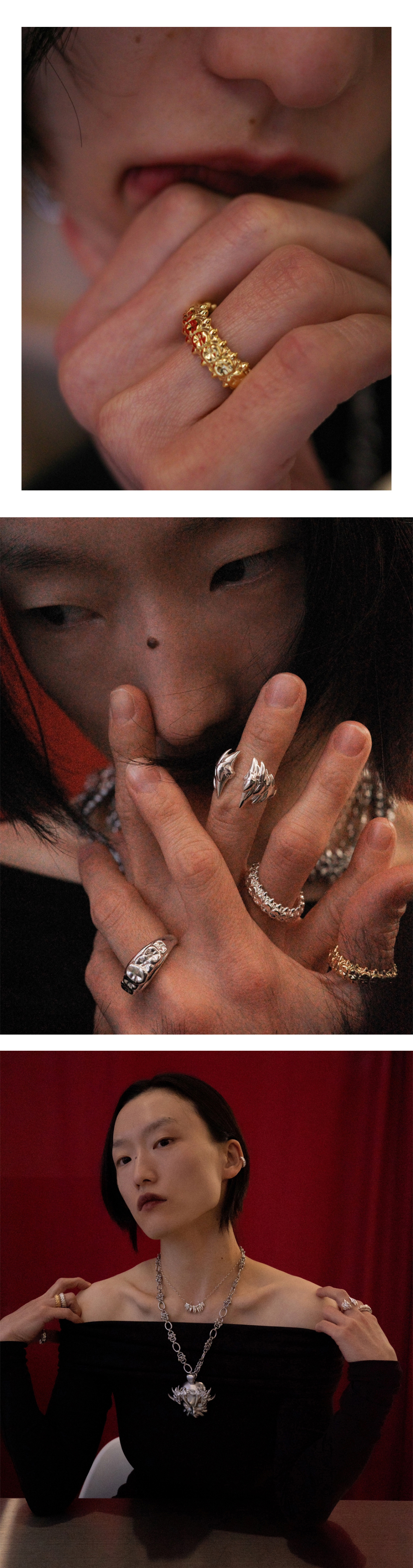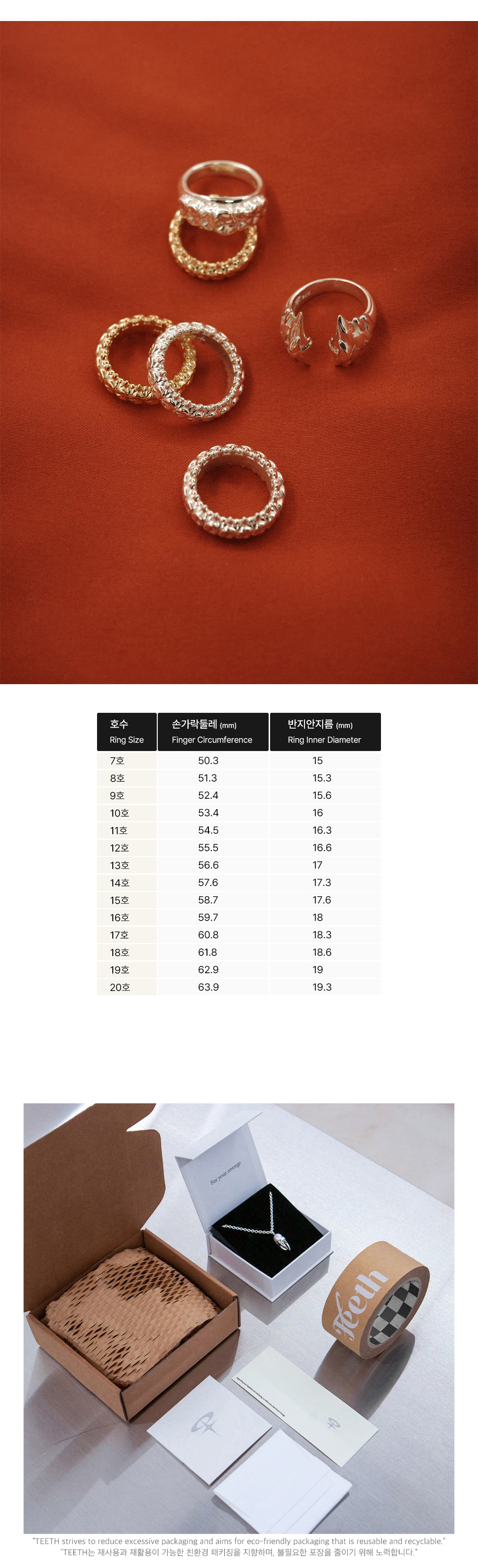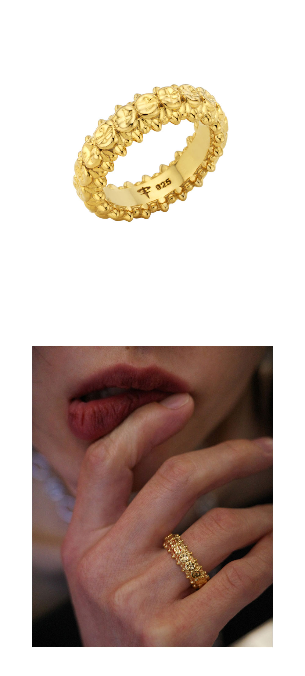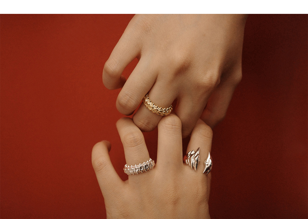 어금니를 바탕으로 한 형태에, 송곳니처럼 솟은 돌기가 반복된 링입니다. 둥근 베이스 위에 뾰족한 요소가 이어지며, 덩굴에 엮인 듯한 이미지를 연상시킵니다.