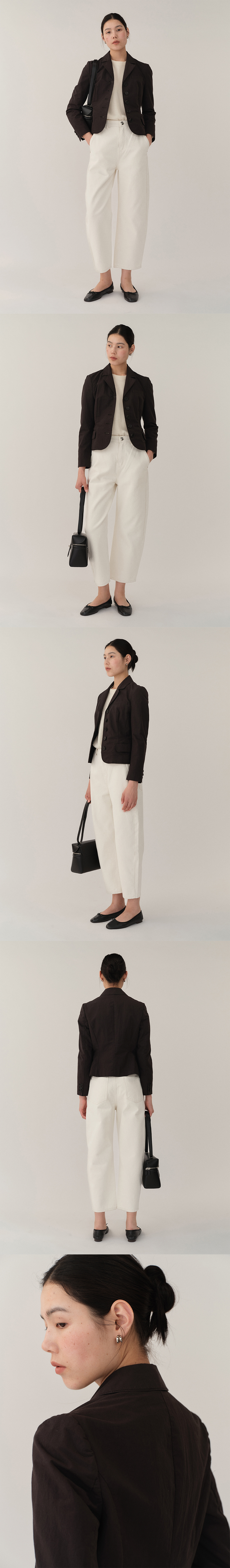 크롭 기장의 슬림핏 워시드 면 재킷 노치드 테일러드 라펠, 나일론 혼방의 편안함 착용감, 바이오 워싱 마감, 8부 기장의 소매감, 소뿔 단추.