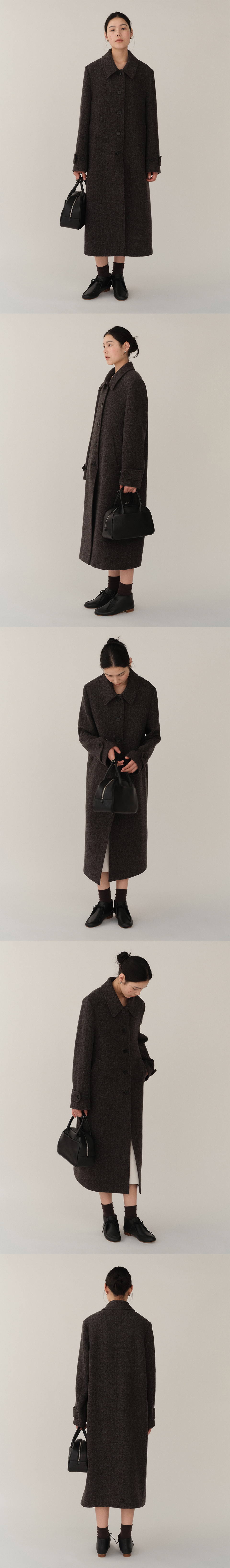 미디 기장의 맥 코트 레귤러 핏, 비스코스 안감 내장, 앞면 웰트 포켓, 로고 각인 디테일의 버튼. 울 100% 펠트지 사용