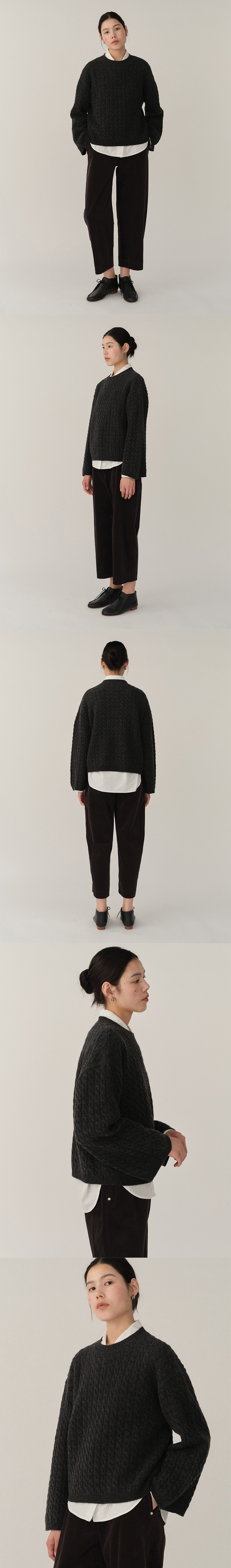 캐시미어 혼방의 트위스트 스웨터. 넉넉한 실루엣, 약간의 크롭 기장, A라인으로 퍼지는 소매 실루엣, 더블 골지 네크라인과 소맷단/밑단이 특징.