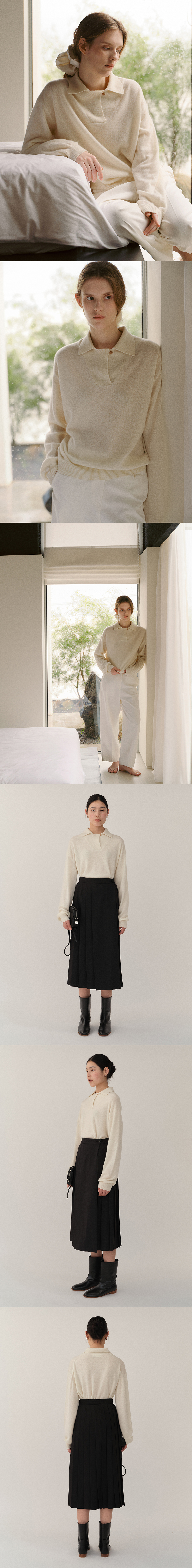 100 % 캐시미어 소재의 롱 슬리브 폴로 스웨터. 원 버튼 클로저와 섬세한 골지 소매/밑단, 넉넉한 실루엣과 소프트한 터치.