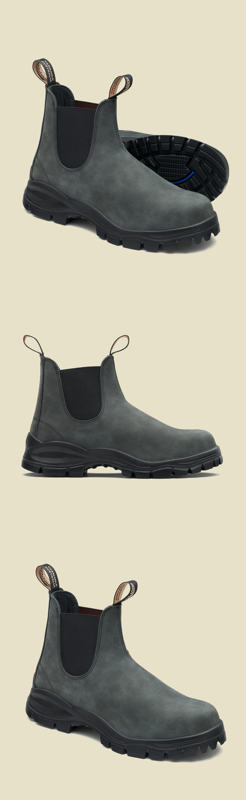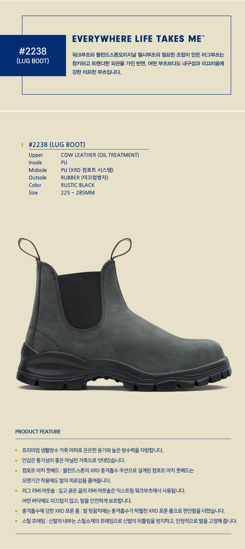 MAKING LIGHT WORK OF HARD WORK FOR 150 YEARS. 블런드스톤 부츠 하나면 충분 합니다. 1870년 부터 150년간 오직 부츠만 만들어 온 호주의 블런드스톤은 압도적인 내구성과 편안함으로 오늘날 세계에서 가장 사랑받는 첼시부츠 입니다. LUG #2238 워크부츠와 블런드스톤 오리지널 첼시부츠의 절묘한 조합이 만든 러그부츠 청키하고 트렌디한 외관을 가진 반면,어떤 부츠 보다도 내구성과 미끄러움에 강한 터프한 부츠입니다.