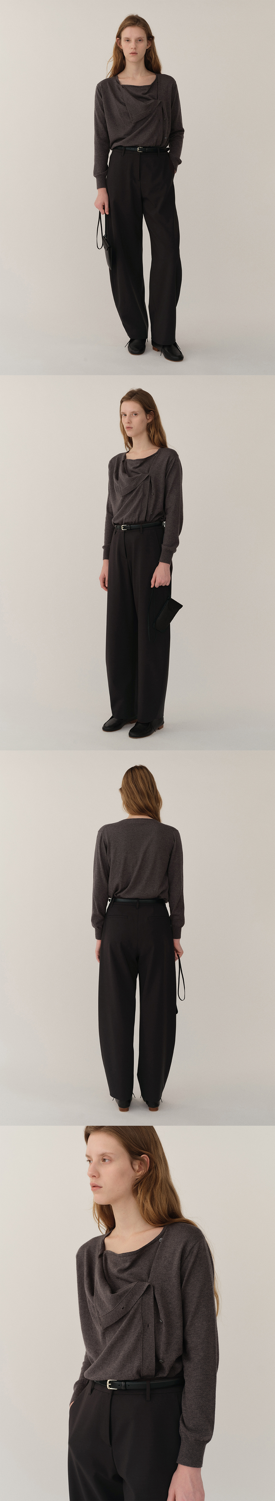 배럴 라인의 로우 라이즈 클래식 롱 트라우저. 크리미한 질감과 흐르는 느낌, 구김이 적음, 옆면 슬래시 포켓.