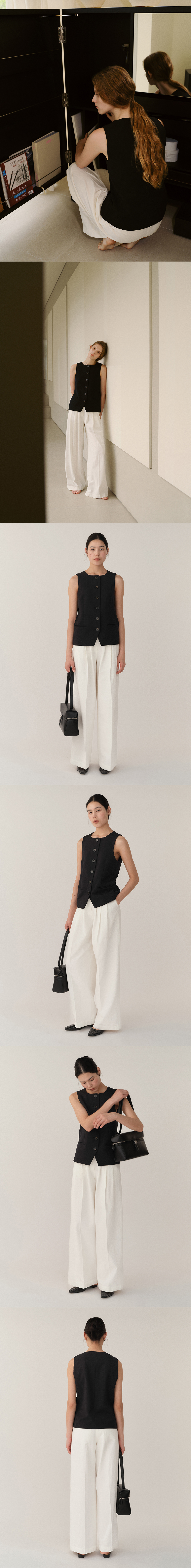 코튼 와이드 로우 라이즈 팬츠. 쓰리 턱 디테일, 코튼 소재의 견고함, 세미 와이드 핏, 아이템 배합에 따라 스타일링 연출이 가능한 활용도 높은 제품.