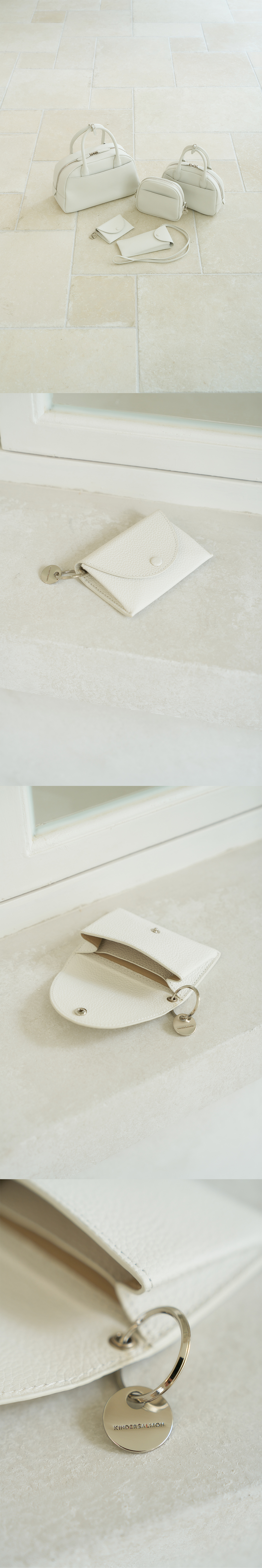 오플 엠보의 이태리 (Tannery FAEDA) 소가죽. 스냅 장식으로 편하게 열고 닫을 수 있는 덮개. 카드를 구분해서 보관할 수 있도록 나눠진 수납공간. 로고 각인 디테일의 금속 키링 장식 디테일.