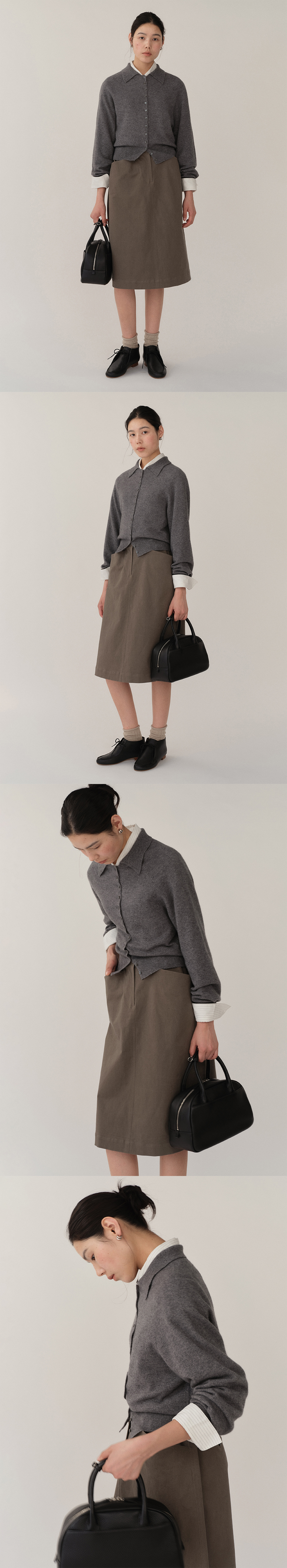 에이라인 면 미디 스커트 원 버튼, 웨이스트 밴딩 디테일, 에이라인 실루엣, 바이오 워싱 마감