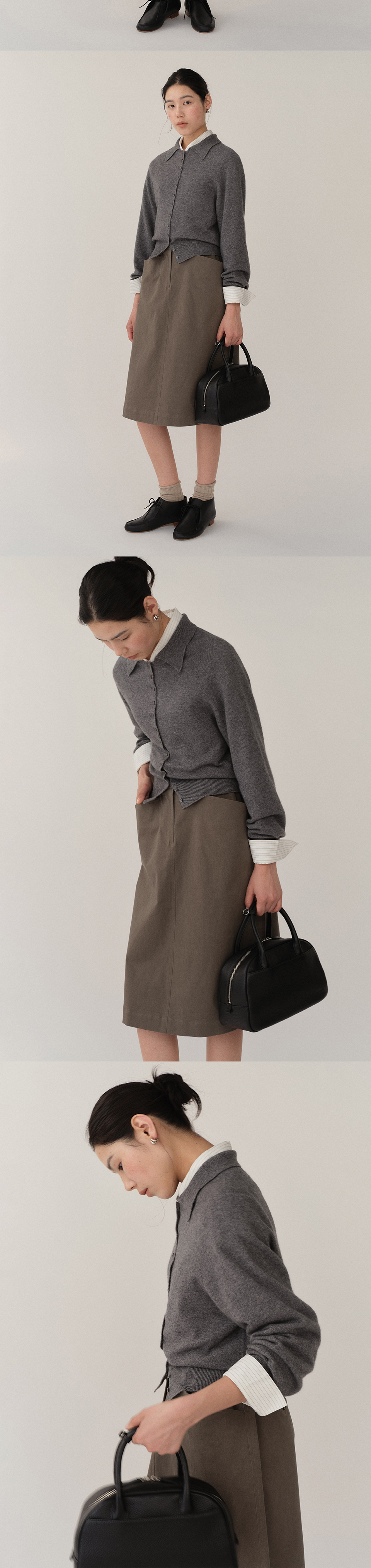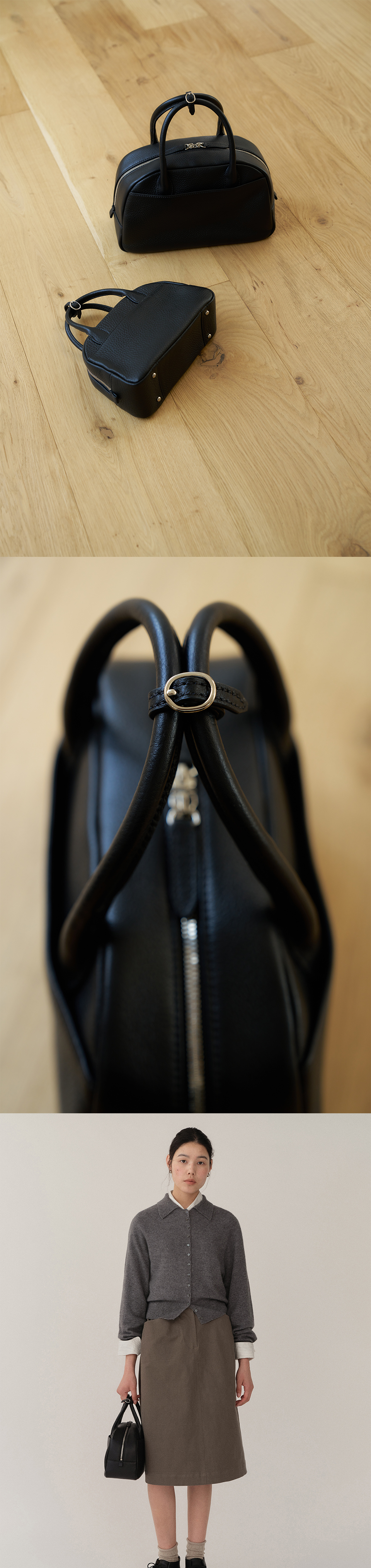 자연스러운 가죽의 질감이 느껴지는 슈렁큰 소가죽. 클래식한 형태로 다양한 착장에 매칭 가능한 토트백. 간편한 수납을 위한 두개의 외부 오픈 포켓. 로고가 새겨진 가죽 라벨이 부착된 한개의 내부 포켓. 양 방향으로 오픈 클로징이 가능한 YKK 지퍼. 핸들을 고정해주는 금속 버클 장식 고리. 가방을 안정적으로 지지해주는 둥근 발장식.