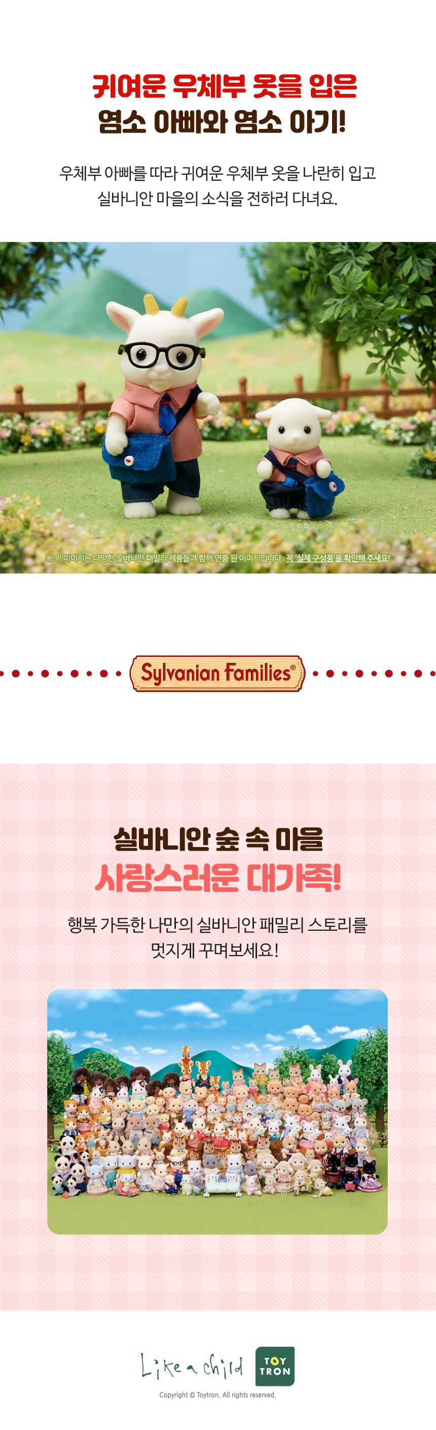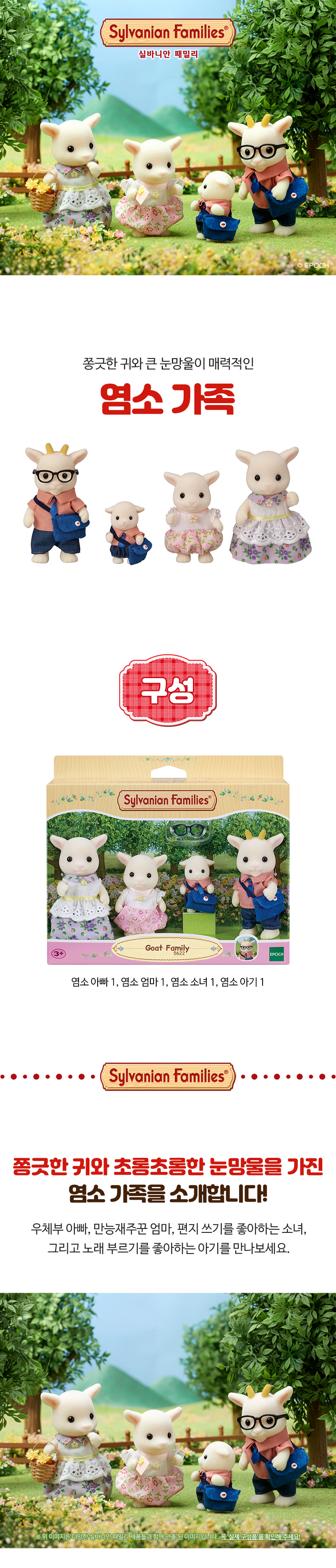 * 실바니안 마을의 중요한 편지와 소포를 배달하는 우체부 염소 아빠, 옷부터 소품까지 만능재주꾼 염소 엄마, 편지 쓰기를 좋아하는 염소 소녀 그리고 그네를 타면서 노래 부르는 것을 종하나는 염소 아기. * 귀여운 가방과 안경이 포함되어 있어요! * 염소 가족 세트에는 집배원 염소 아빠 빌리, 엄마 낸시, 소녀 맨디, 아기 제니가 있는 실바니안 가족 상품입니다. * 실바니안 피규어는 머리와 팔다리를 움직여 다양한 포즈를 만들 수 있어요. * 3세 이상 연령에 적합합니다. * 아이들을 위한 상상력 있는 역할극을 자극합니다 * 다른 집 및 가구(별도 판매)와 결합하여 훨씬 더 재미있는 역할놀이를 할 수 있습니다!