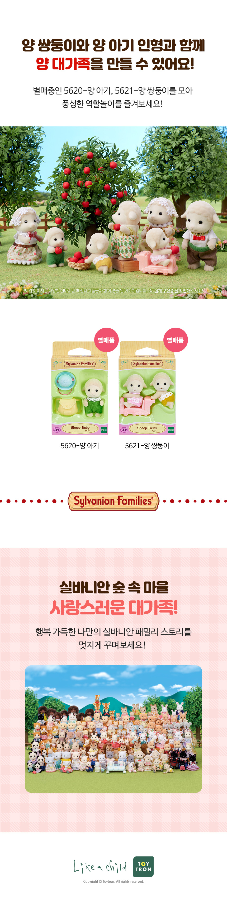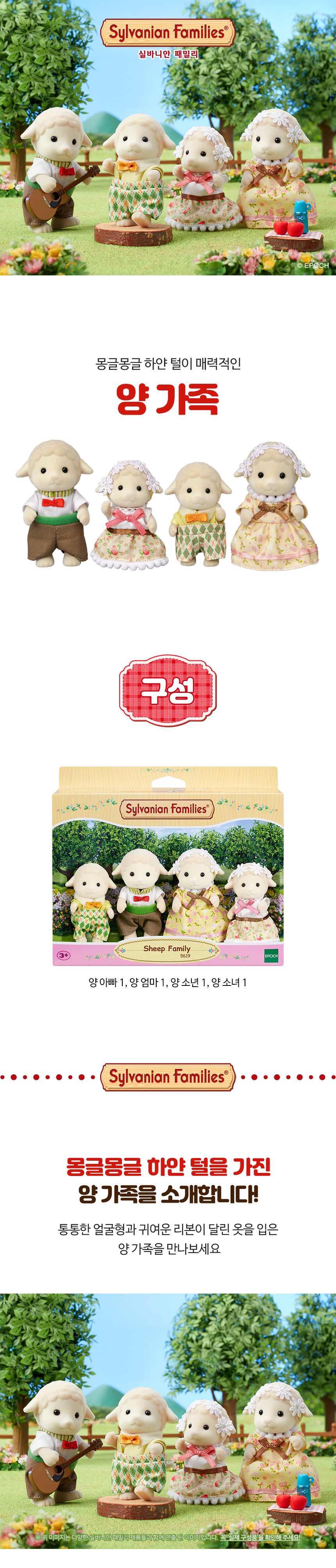 * 몽글몽글한 하얀 털을 가진 양 가족은 양 아빠, 소년, 향기로운 꽃 머리 장식을 한 엄마와 소녀가 있는 상품입니다. * 2020년 실바니안 가족 선거에서 3위를 차지했던 인기 상품입니다. * 실바니안 피규어는 머리와 팔다리를 움직여 다양한 포즈를 만들 수 있어요. * 3세 이상 연령에 적합합니다. * 아이들을 위한 상상력 있는 역할극을 자극합니다 * 다른 집 및 가구(별도 판매)와 결합하여 훨씬 더 재미있는 역할놀이를 할 수 있습니다!