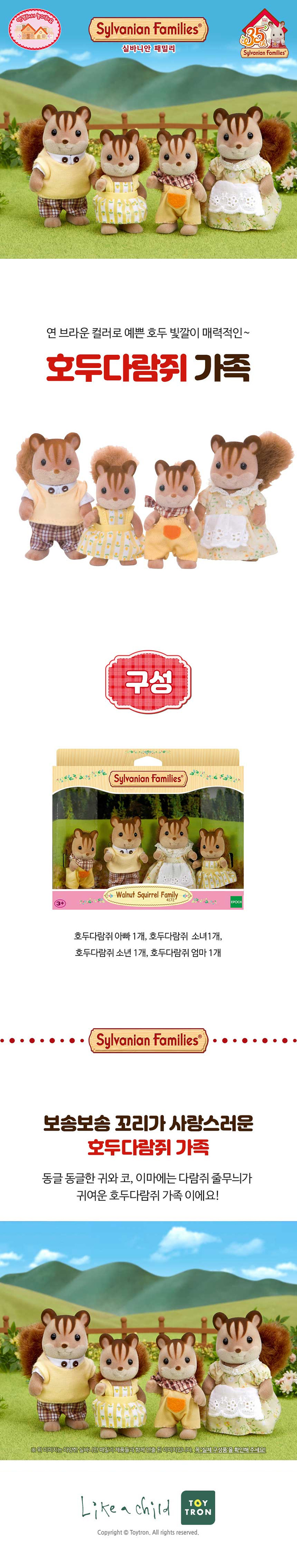 동글 동글한 귀와 코, 이마에는 다람쥐 줄무늬가 귀여운 다람쥐 가족 입니다. 탐스럽고 귀여운 꼬리는 부드러우며 , 뒷모습 까지도 사랑스럽습니다. 연 브라운 컬러로 예쁜 호두 빛깔을 띕니다. 보송보송 꼬리가 사랑스러운 호두다람쥐 가족은 4인구성 유럽버젼 입니다.