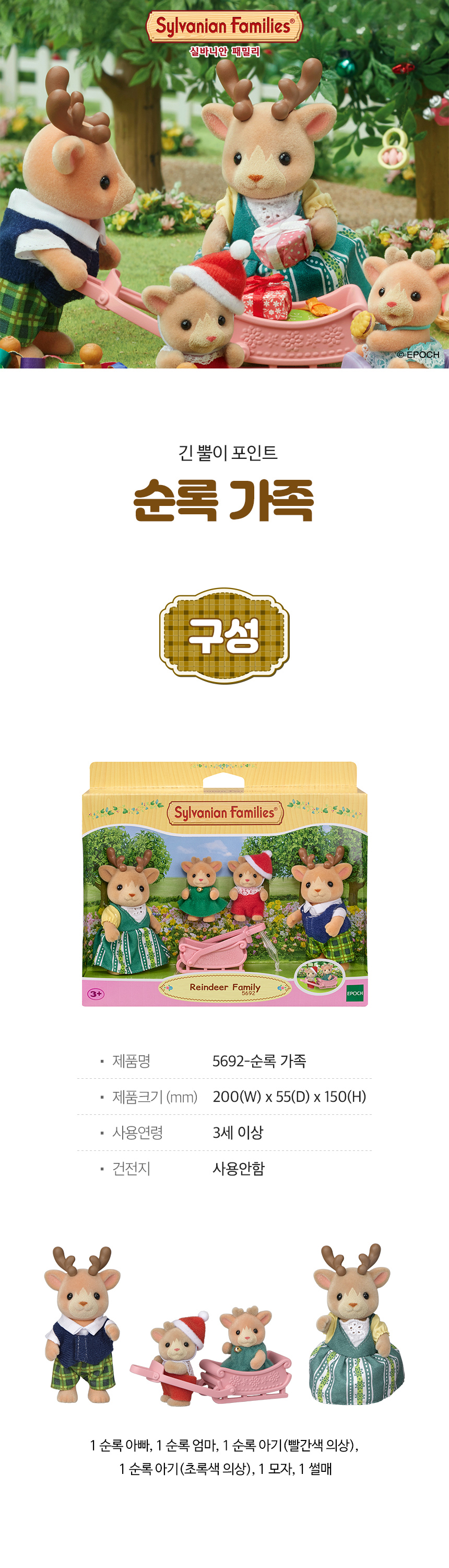 *순록 아빠 졸리, 엄마 엘름, 산타 모자를 쓴 아기 루이, 트리 의상을 입고 있는 이브 그리고 썰매가 포함되어 있습니다 *크리스마스 느낌이 물씬나는 순록 가족을 만나보세요 *실바니안 피규어의 머리와 팔다리를 움직여 다양한 포즈를 만들 수 있어요 *피규어의 의상은 벗길 수 있어서 다른 의상을 입힐 수 있어요