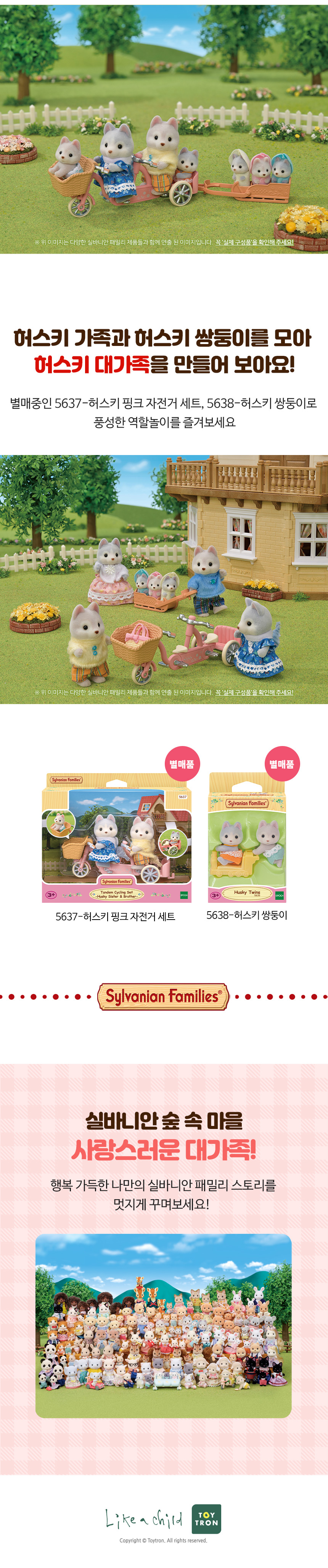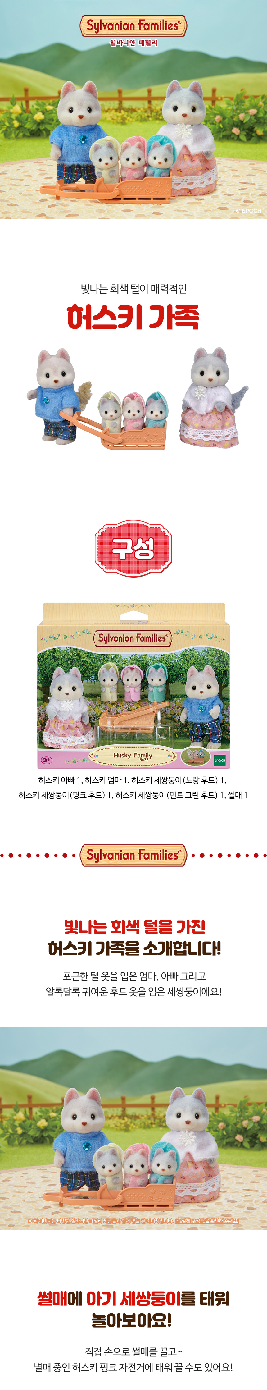 * 빛나는 회색털을 가진 허스키 가족은 아빠 빈센트, 엄마 에이브릴, 세 쌍둥이 래, 드레이크, 넬리와 썰매가 포함되어 있는 상품입니다. * 귀여운 후드 옷을 입은 세쌍둥이를 썰매에 태워 썰매를 끌고 놀 수 있습니다. * 이 세트에는 피규어와 액세서리가 포함되어 있으며 단독으로 플레이할 수 있습니다. * 실바니안 피규어는 머리와 팔다리를 움직여 다양한 포즈를 만들 수 있어요. * 3세 이상 연령에 적합합니다. * 아이들을 위한 상상력 있는 역할극을 자극합니다 * 다른 집 및 가구(별도 판매)와 결합하여 훨씬 더 재미있는 역할놀이를 할 수 있습니다!