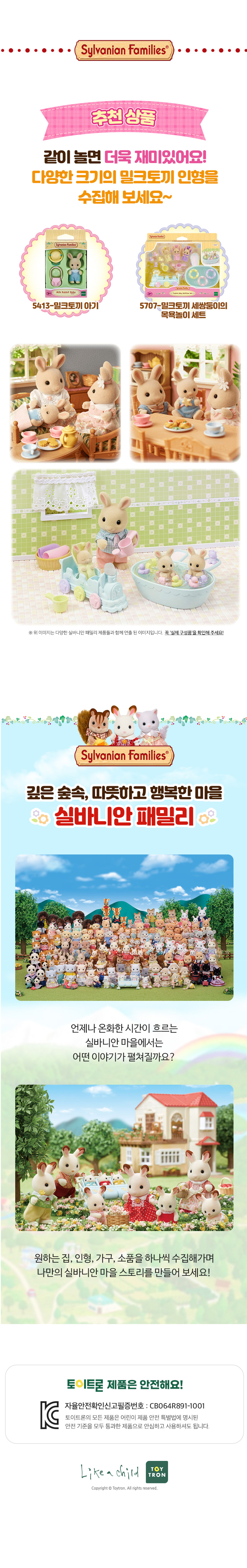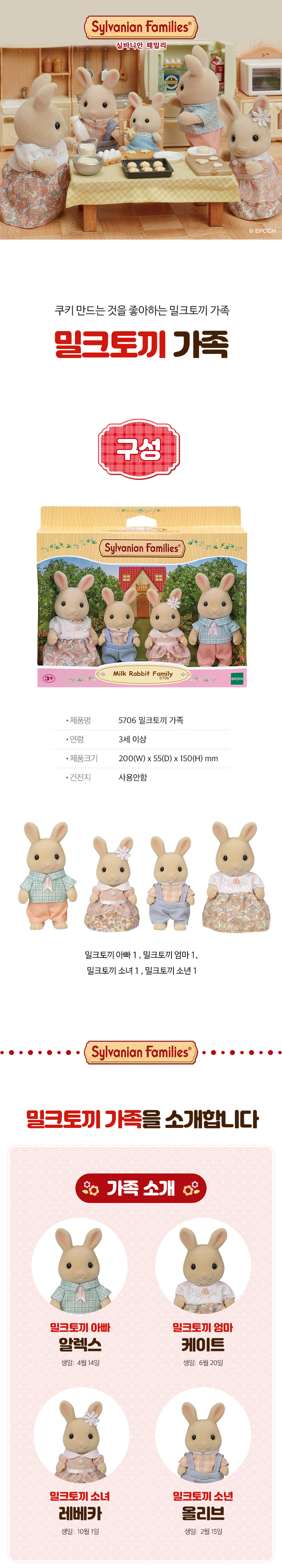 *밀크토끼 아빠 알렉스, 밀크토끼 엄마 케이트, 밀크토끼 소년 올리버 그리고 밀크토끼 소녀 레베카를 소개합니다~ *밀크토끼 가족들은 쿠키 만드는 것을 좋아해요. *밀크토끼 가족들은 상큼한 핑크와 블루 색의 의상을 입고 있어요. 엄마와 소녀는 꽃무늬의 사랑스러운 드레스를 입고 있답니다. *실바니안 피규어는 머리와 팔다리를 움직여 다양한 포즈를 연출할 수 있어요. 또한 의상은 탈의가 가능하여 다양한 의상을 갈아 입힐 수 있습니다.