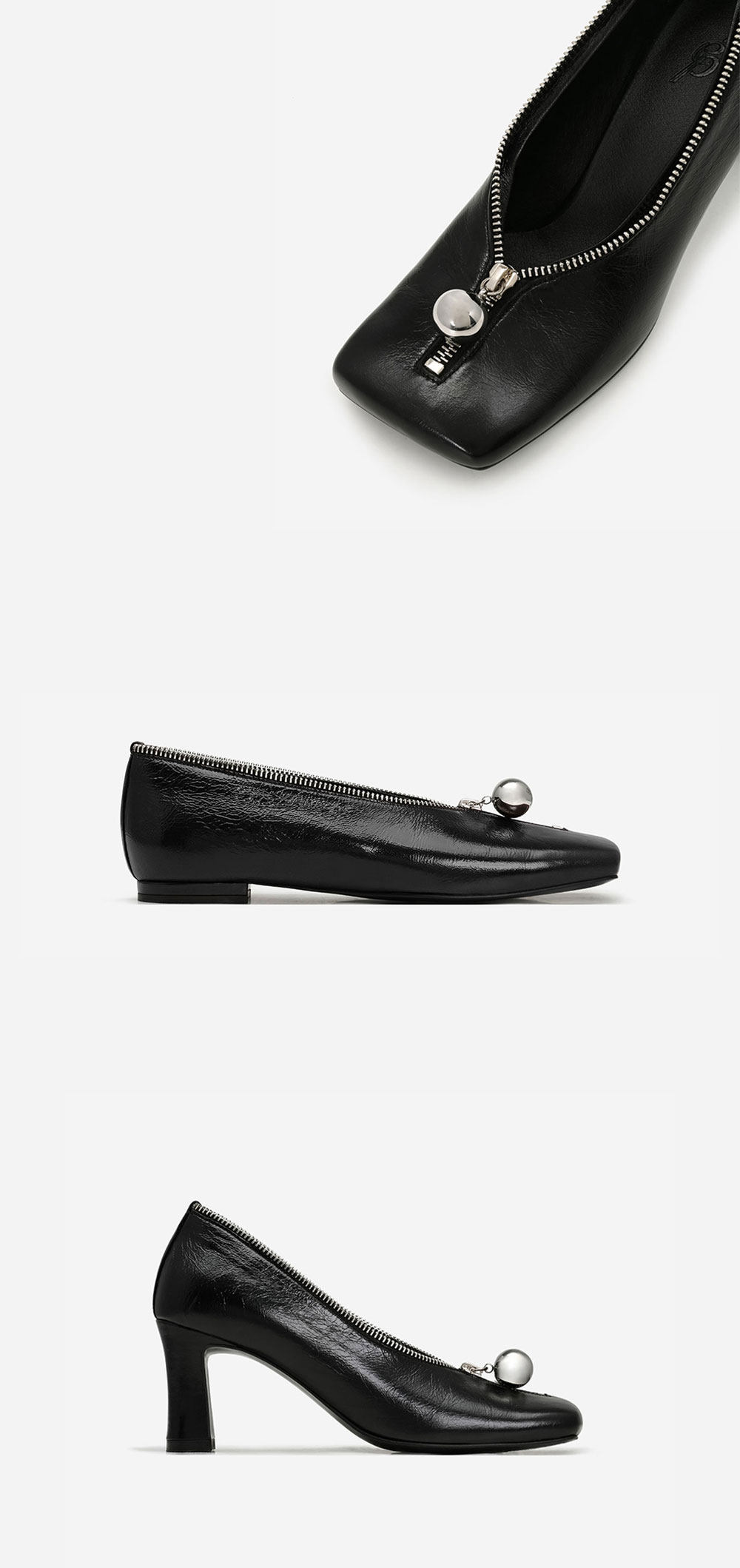 * 1:1 주문 제작으로 진행 되어 배송까지 약 7-14일 소요되실 수 있으며, 교환 및 반품은 불가한 점 참고 부탁드립니다. 감각적인 형태의 세미-스퀘어 앞코와 깔끔한 실버 장식의 조화로 유니크하면서도 한층 더 절제된 무드를 완성합니다. 앞코와 부드럽게 연결되는 발등 라인은 착용 시 안정감 있게 발등을 감싸주며, 발을 넣고 빼기에 불편하지 않도록 적당한 길이로 설정되었습니다. 니켈 컬러의 지퍼가 슈즈 입구를 감싸 장식적인 요소로 작용하고, 지퍼 슬라이더에는 실버볼 장식이 더해져 있습니다. 이 지퍼는 기능이 없고 고정된 형태입니다. 굽은 1cm와 7cm로 선택하여 제작할 수 있습니다.